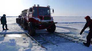 Экспедиция с 4 марта по 9 марта проехала около тысячи километров по зимнику Ванкор-Нефть до Дудинки. По зимнику машины шли со скоростью 10-15 км/час, в сутки проходили до 200 км. На Енисее была вода под снегом из-за спуска воды с плотины Красноярской ГЭС, но легкие "Емели" совсем не проваливались. А вот тяжелым "Уралам" приходится стоять на зимнике и ждать когда замерзнет верховая вода на Енисее. В Дудинке экспедицию встретил начальник Дудинского отделения "Норникеля" хороший человек Уздин Игорь Борисович. Оба "Емели" с прицепами размещены в теплых боксах гаража, а ребят Игорь Борисович разместил на борту ледокола "Дудинка". Сегодня 10 марта производится ремонт одного сломаного вала заднего моста "Емели-4" и лечение простудившихся молодых механиков Андрея Ванькова и Алексея Зайцева. У опытных Мастеров спорта международно класса Василия Елагина, Владимира Обихода, Сергея Исаева и Владимира Яночкина процесс акклиматизации к Сибирским температурам прошел незаметно для их крепких организмов :-)). Штаб экспедиции в Москве ожидает выдачи паспортов с Канадскими визами для всех семерых участников МЛАЭ-2011 и ведет переписку с офицером связи Стефеном Хойтом (Stephen Hoyt), назначенным Офисом Арктических Экспедиций Канадского Агентства Пограничной Службы (Canada Border Services Agency - CBSA).