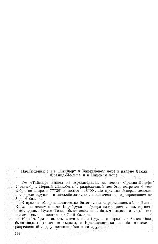 Г/с «Таймыр» вышел из Архангельска на Землю Франца-Иосифа 2 сентября. Первый мелкобитый, разреженный лед был встречен 6 сентября на широте 77°20' и долготе 48°00/. До пролива Миерса ледокол шел среди крупно- и мелкобитого льда в количестве, варьировавшем от 3 до 6 баллов.