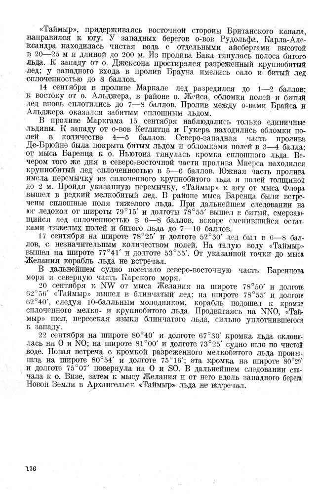 20 сентября к NW от мыса Желания на широте 78°50' и долготе 62°56' «Таймыр» вышел в блинчатый' лед: на широте 78°55' и долготе 62°40', следуя 10-балльным молодняком, корабль подошел к кромке сплоченного мелко- и крупнобитого льда. Продвигаясь на NNO, «Таймыр» шел, пересекая языки блинчатого льда, сильно уплотнившегося к западу.