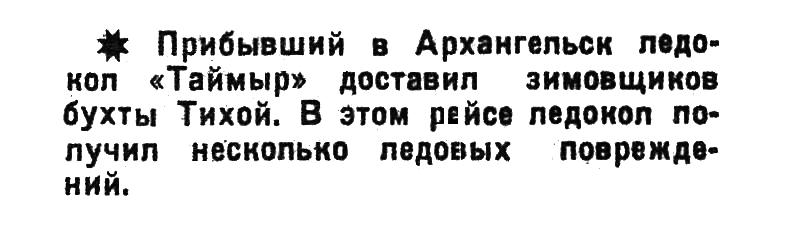 ● Прибывший в Архангельск ледокол «Таймыр» доставил зимовщиков бухты Тихой. В этом рейсе ледокол получил несколько ледовых повреждений.