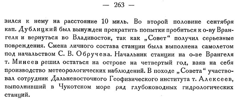 зился к нему на расстояние 10 миль. Во второй половине сентября кап. Дублицкий был вынужден прекратить попытки пробиться к о-ву Врангеля и вернуться во Владивосток, так как „Совет" получил серьезные повреждения. Смена личного состава станции была выполнена самолетом под начальством С. В. Обручева. Начальник станции на о-ве Врангеля т. Минеев решил остаться на острове на четвертый год, взяв на себя производство метеорологических наблюдений. В походе „Совета" участвовал сотрудник Дальневосточного Геофизического института т. Алексеев, выполнивший в Чукотском море ряд глубоководных гидрологических станций.