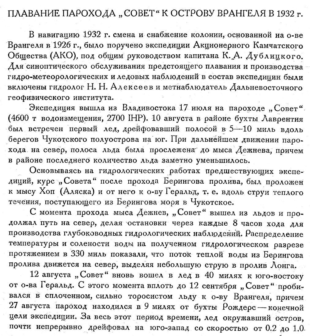 РЕЙС ПАРОХОДА „СОВЕТ" НА ОСТРОВ ВРАНГЕЛЯ в 1932 г., под командой кап. Дублицкого, имел целью снабжение колонии и смену личного состава станции. Несмотря на упорные усилия, „Совет" вследствие тяжелого состояния льдов, не мог подойти к о-ву Врангеля, хотя и прибли-