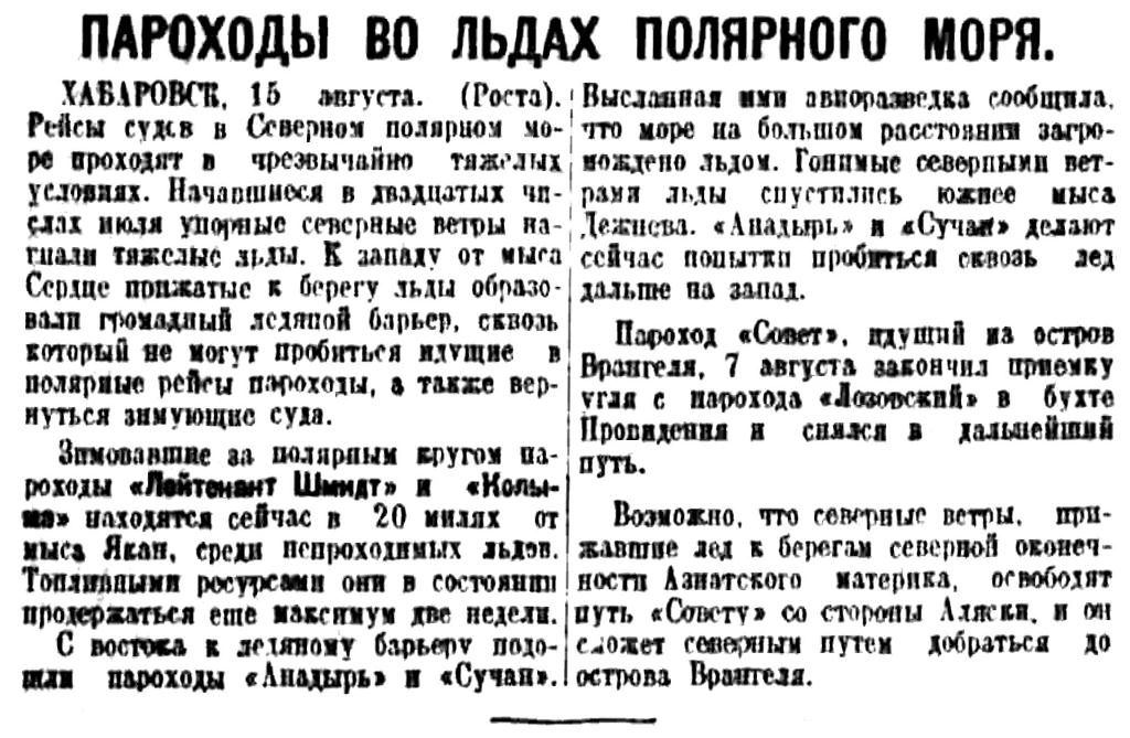 Высланная ими авиоразведка сообщила, что море на большом расстоянии загромождено льдом. Гонимые северными ветрами льды спустились южнее мыса Дежнева. «Анадырь» и «Сучан» делают сейчас попытки пробиться сквозь лед дальше на запад.