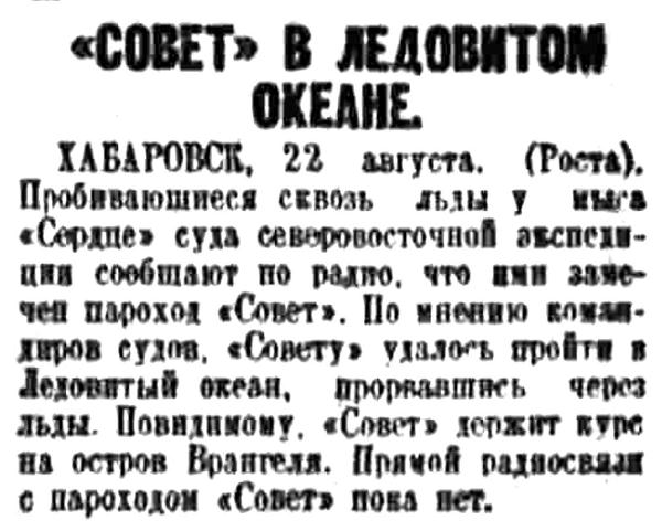 ХАБАРОВСК, 22 августа. (Роста). Пробивающиеся сквозь льды у мыса "Сердце" суда северовосточной экспедиции сообщают по радио, что ими замечен пароход "Совет". По мнению командиров судов, "Совету" удалось пройти в Ледовитый океан, прорвавшись через льды. Повидимому, "Совет" держит курс на остров Врангеля. Прямой радиосвязи с пароходом "Совет" пока нет.