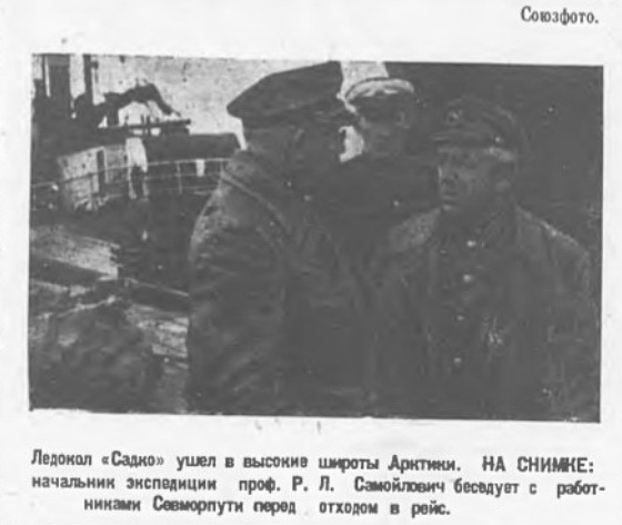 В качестве практиканта на «Садко» будет работать 16-летний сын известного полярного исследователя проф. Самойловича — Владимир, участвовавший три года назад в экспедиции на Новую Землю.