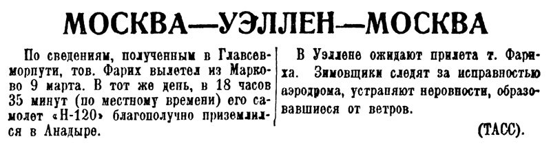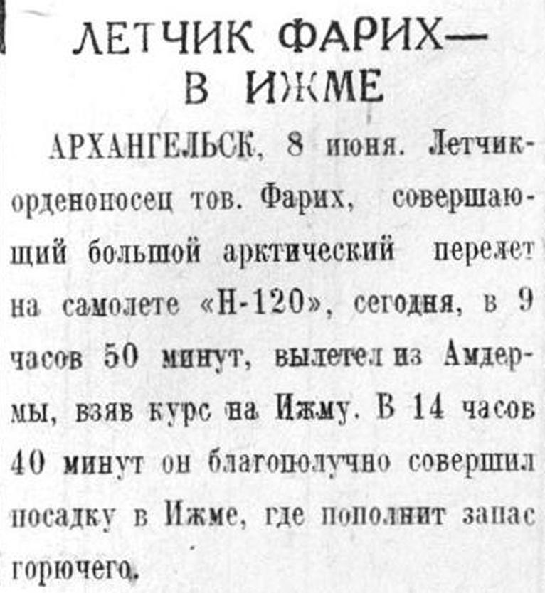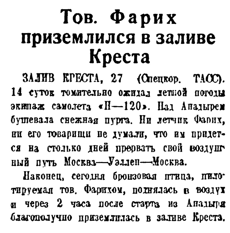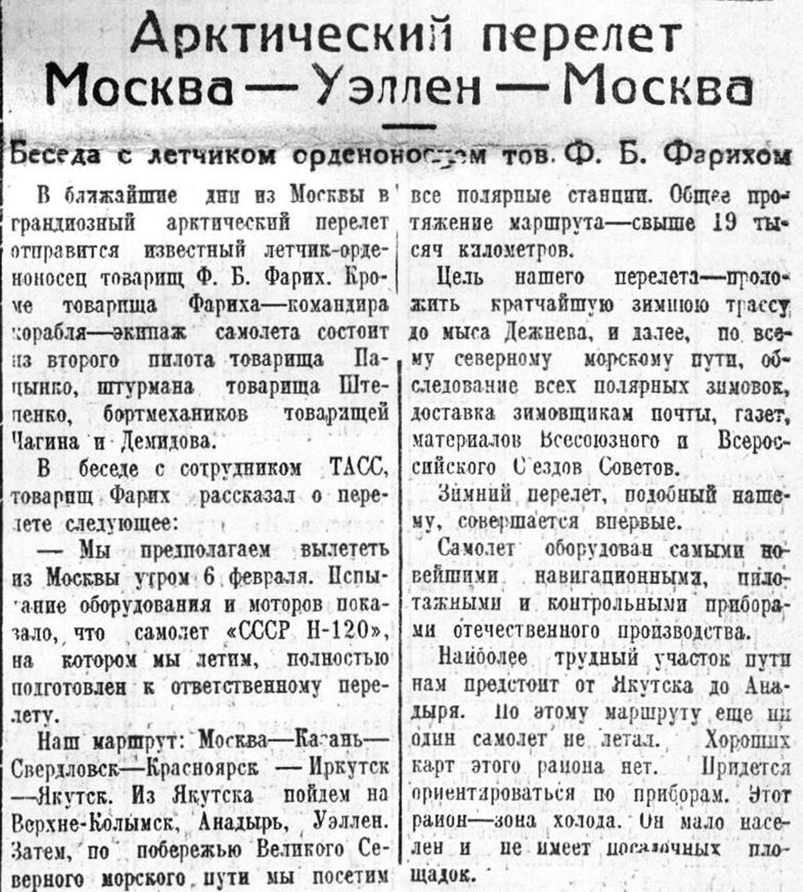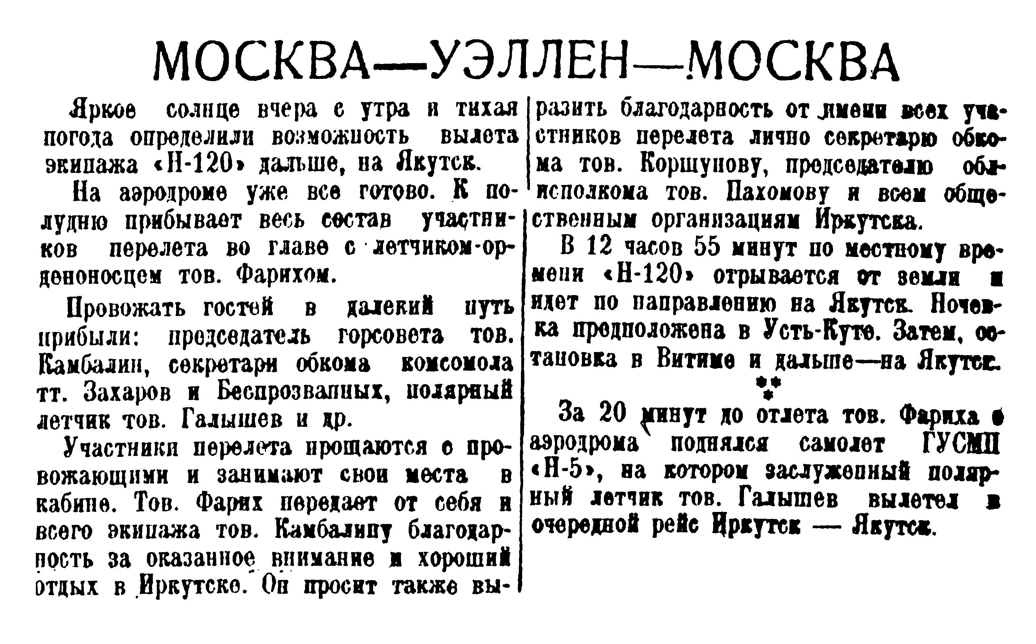 В городе ожидали этот самолет совершающий впервые зимой большой арктический перелёт по маршруту Москва — Уэллен — Москва. Около 20 тысяч километров предстоит пролететь на самолете «Н-120» командиру перелета летчику-орденоносцу тов. Фарих и его экипажу.