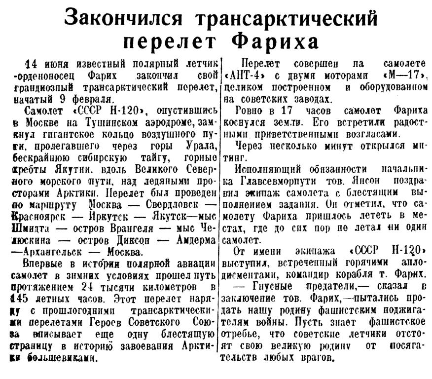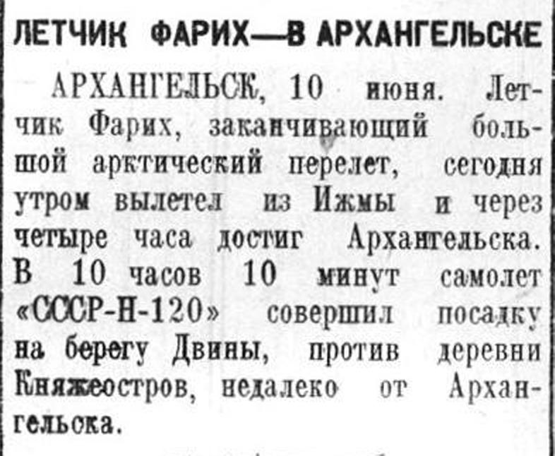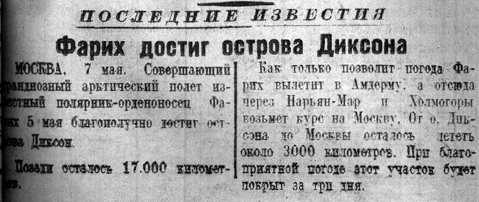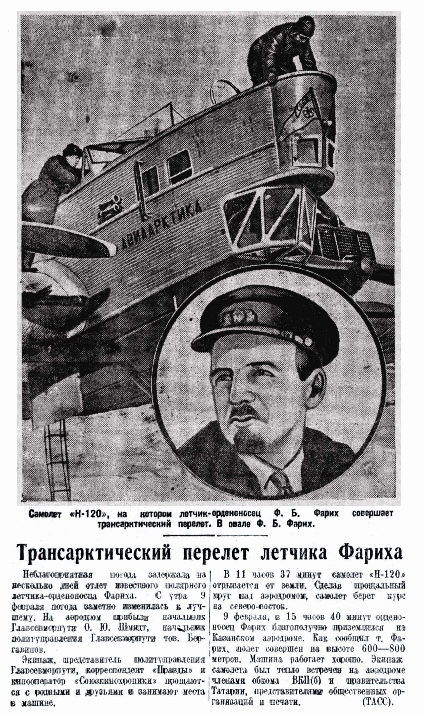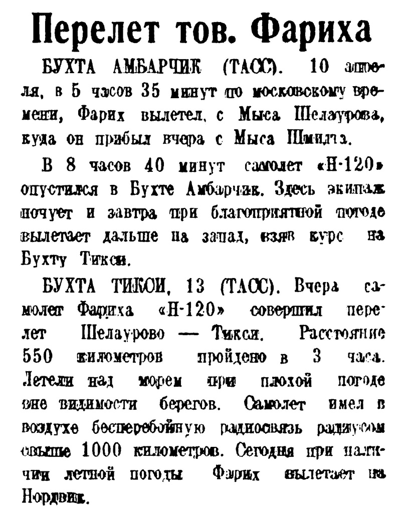 В городе ожидали этот самолет совершающий впервые зимой большой арктический перелёт по маршруту Москва — Уэллен — Москва. Около 20 тысяч километров предстоит пролететь на самолете «Н-120» командиру перелета летчику-орденоносцу тов. Фарих и его экипажу.