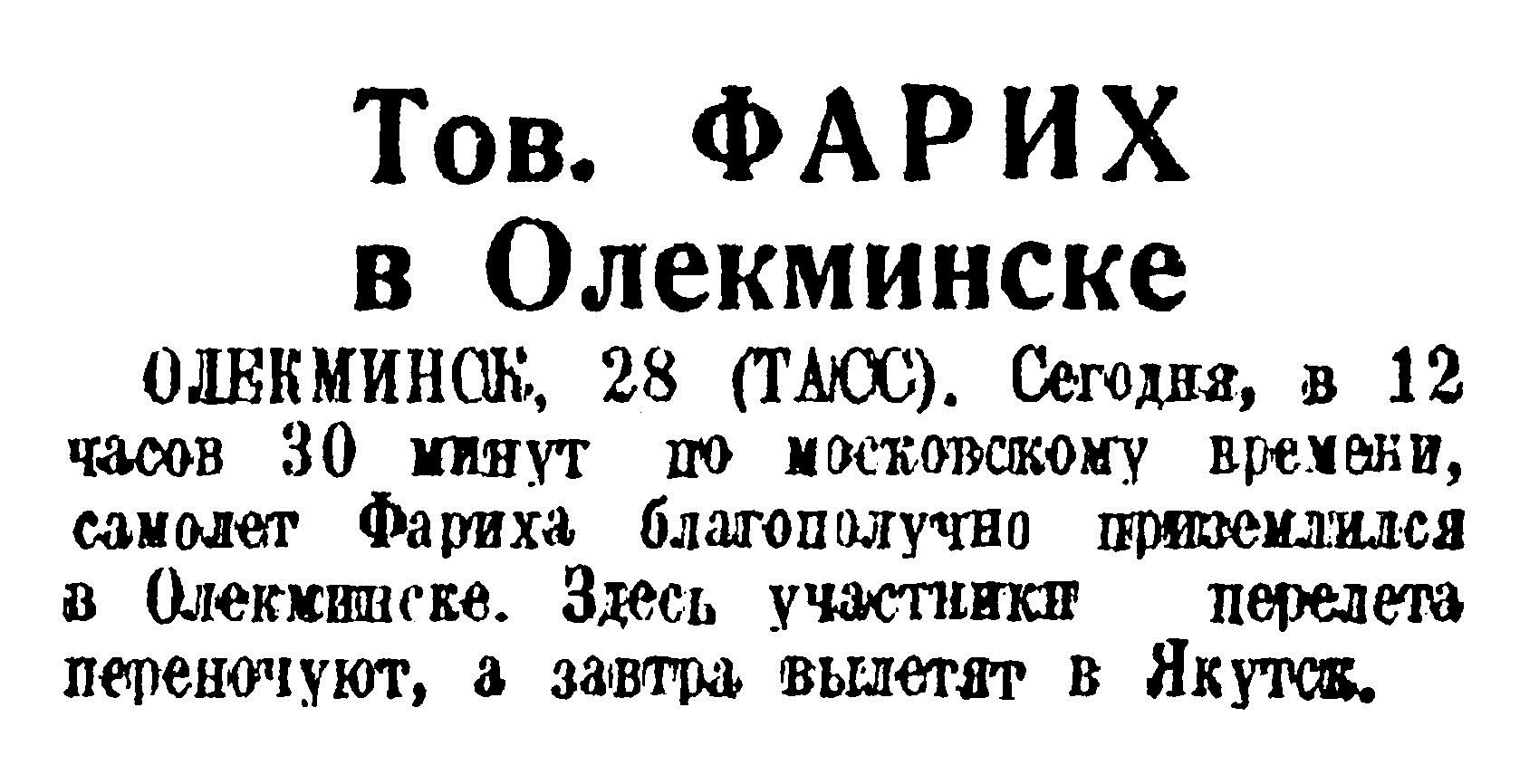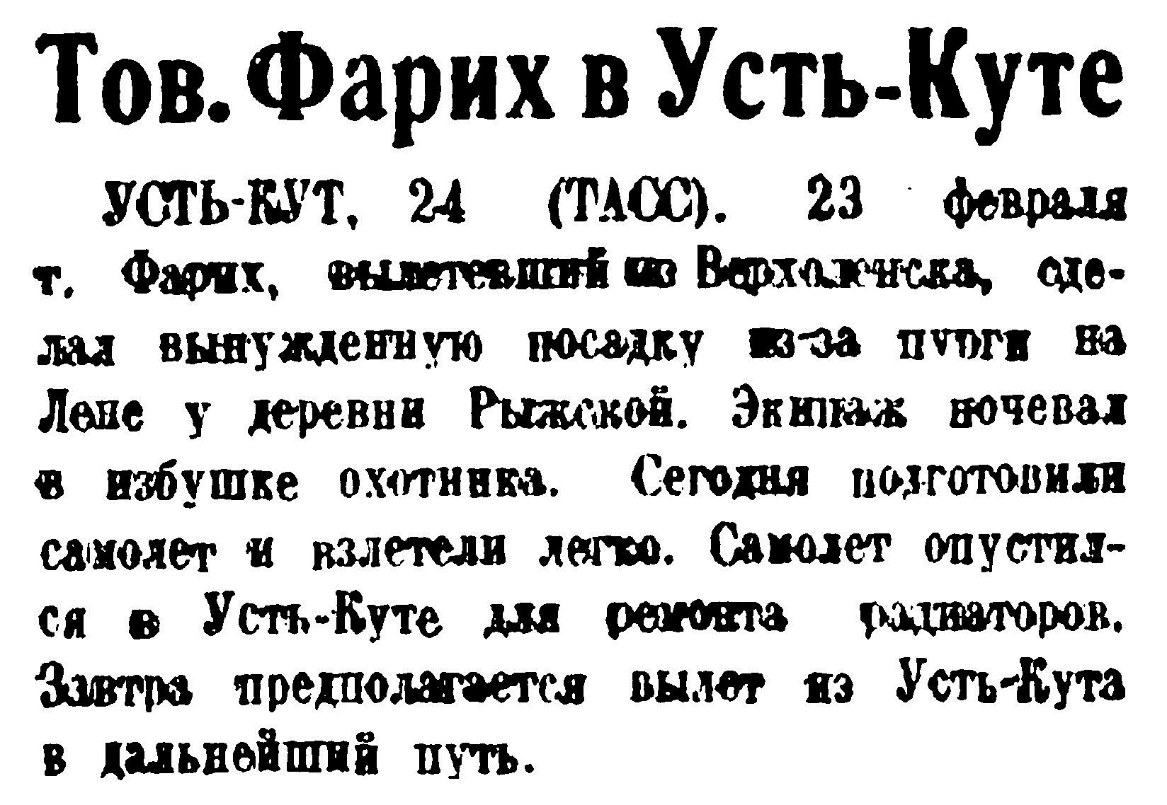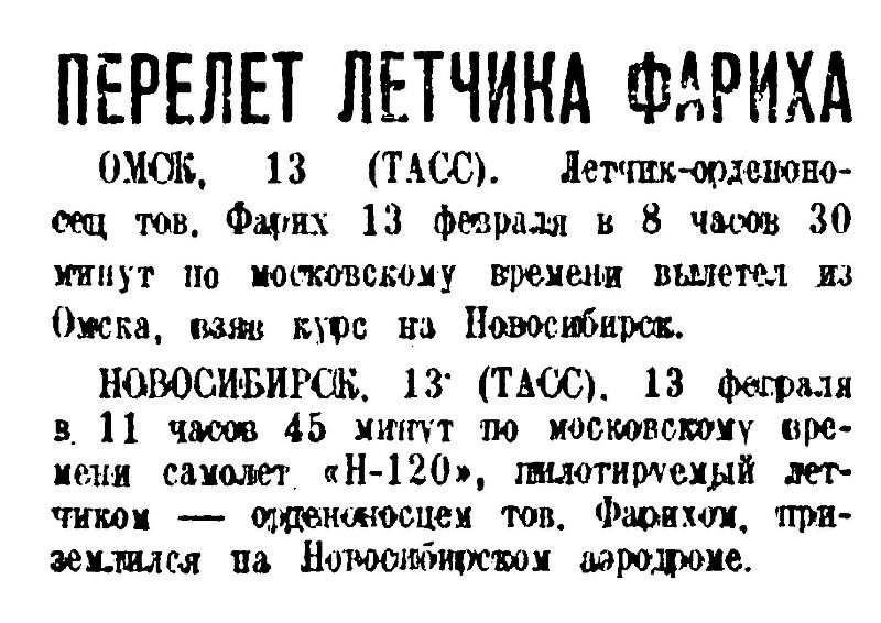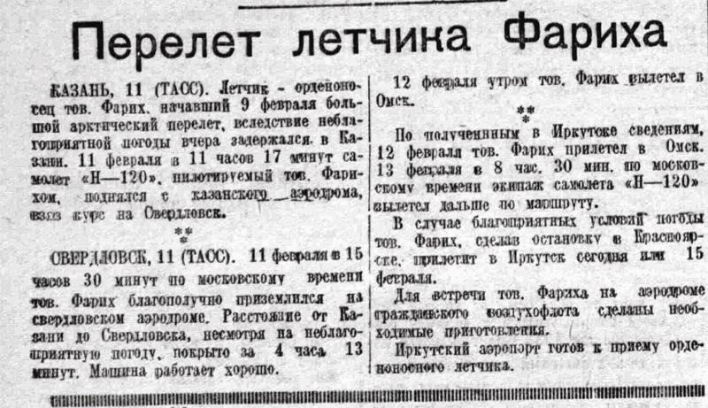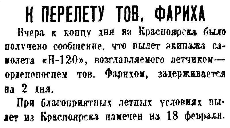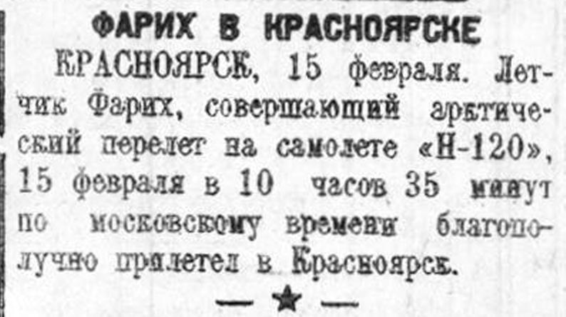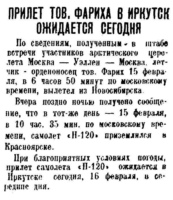 Перелет начался 9 февраля, когда самолет оставил красную столицу СССР — Москву. В пути были сделаны остановки в Казани, Свердловске, Омске, Новосибирске в Красноярске. Вчера, в 6 час. по московскому времени тов. Фарих вылетел из Красноярска на Иркутск.