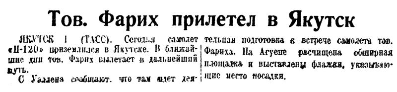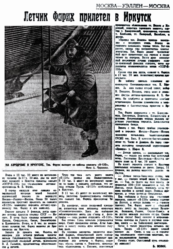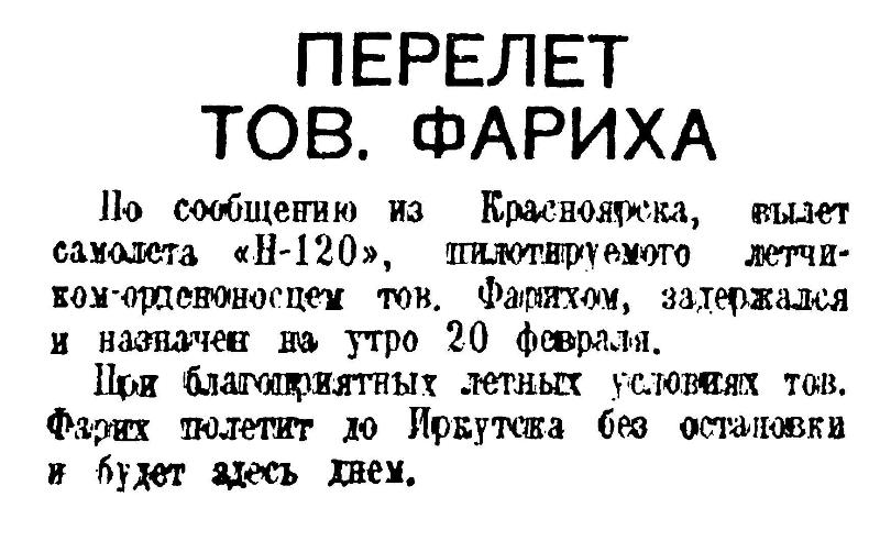 Летчик Фарих прилетел в ИркутскВчера в 12 час. 20 минут по московскому времени (в 17 ч. 20 мин. дня по местному времени) в Иркутск прилетел самолет «СССР-Н-120» под управлением летчика — орденоносца Ф. Б. Фарих.