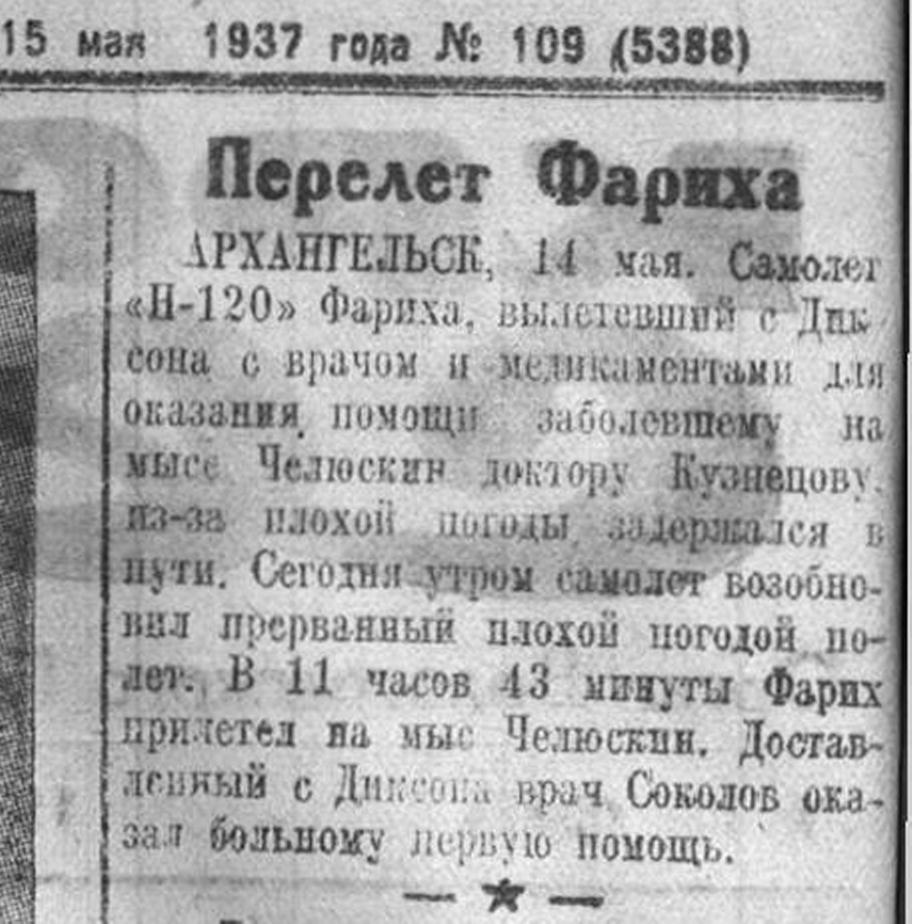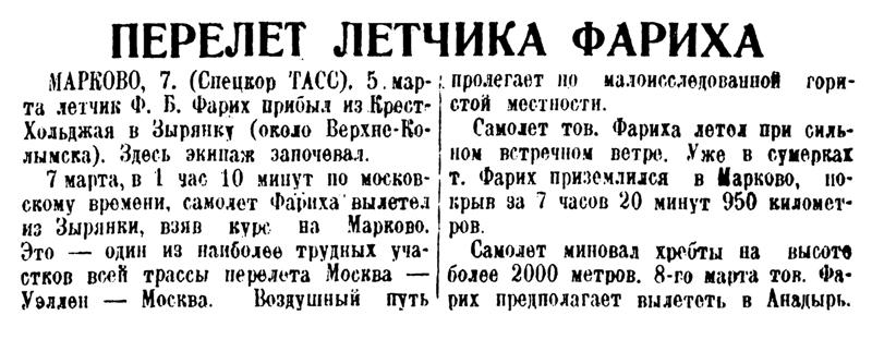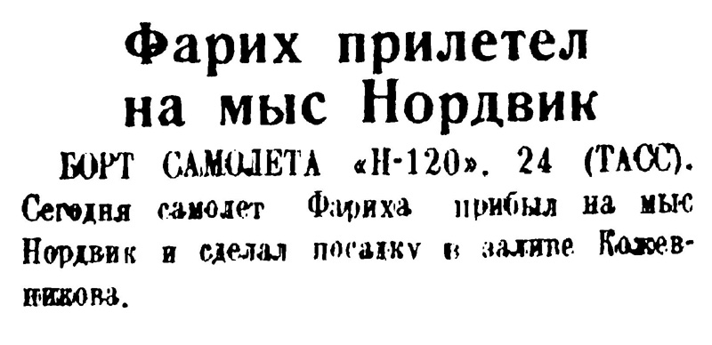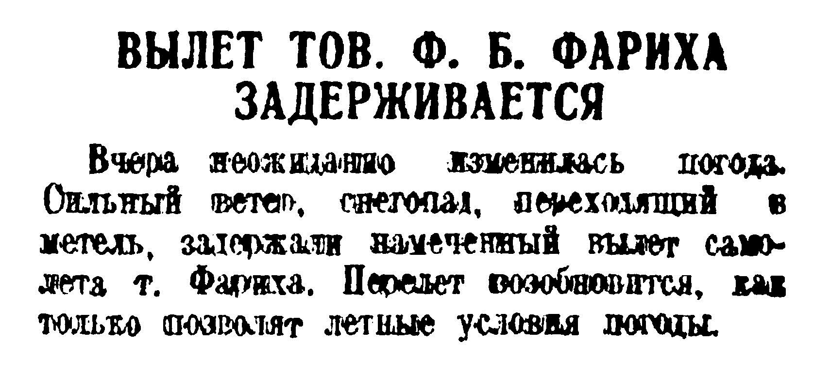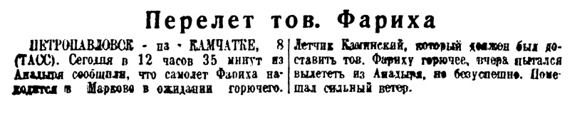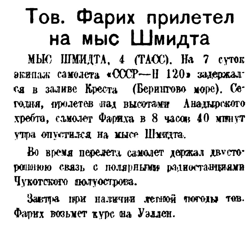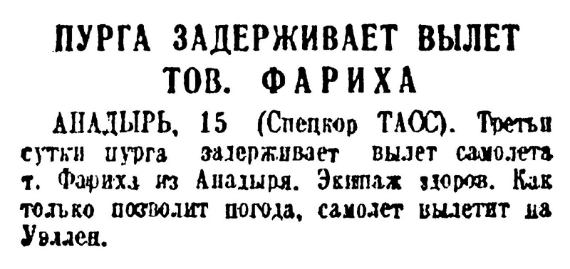 Вместе с тов. Фарих прибыл участвующий в перелёте Москва — Уэллен — Москва помощник начальника политуправления ГУСМП тов. Басс. В качестве бортмехаников летят тт. Чагин и Демидов. На борту самолета находится специальный корреспондент «Правды» т. Шаров В.
