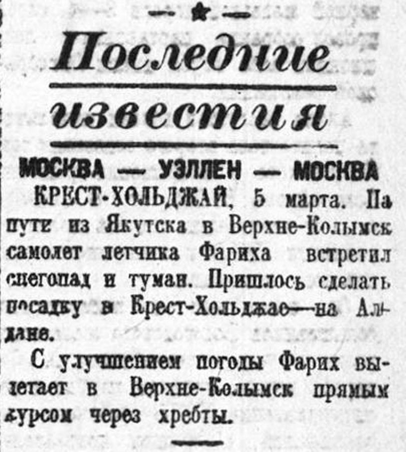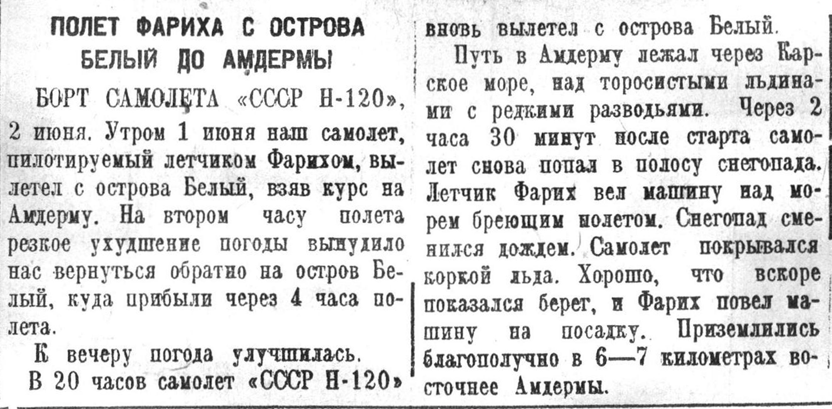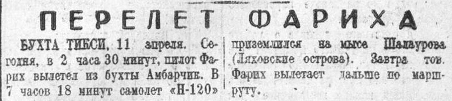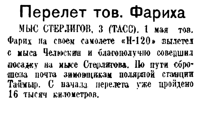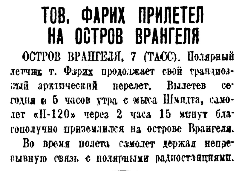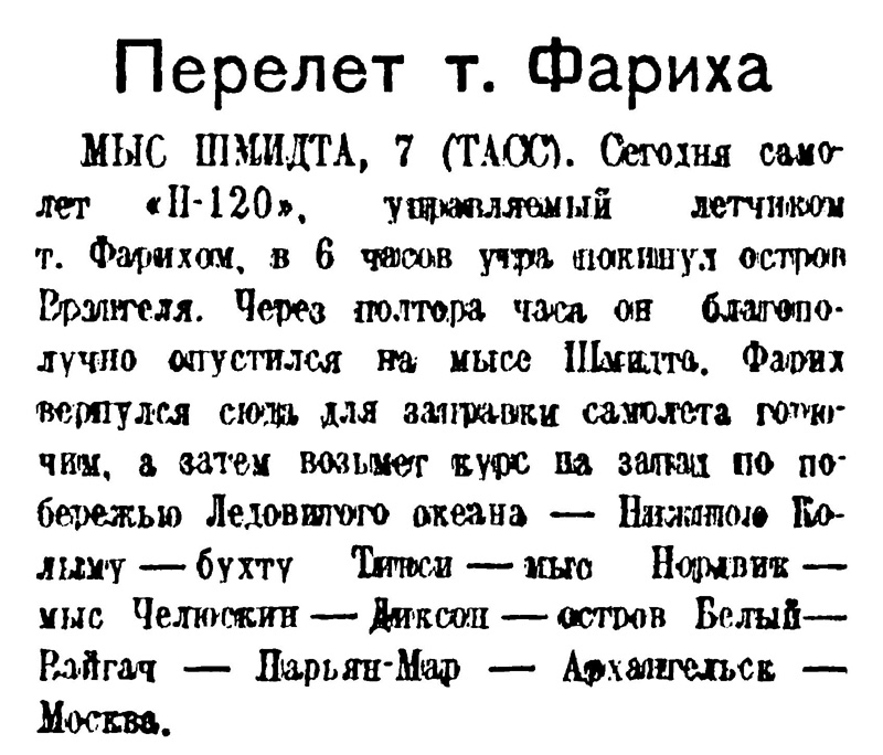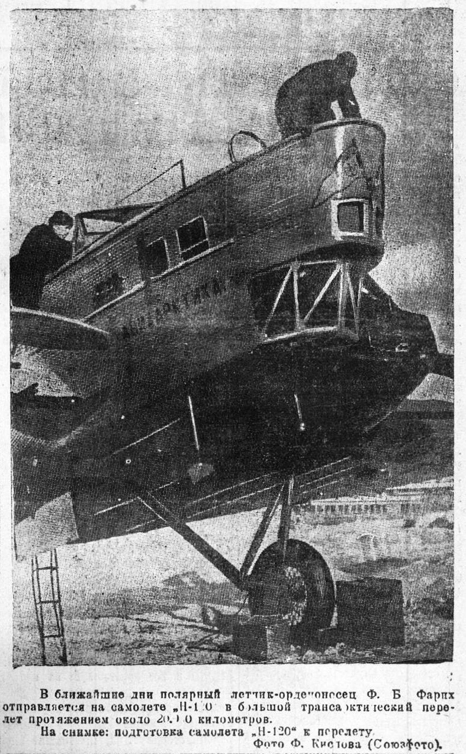 Как сообщали в беседе нам участники перелета, самолет «Н-120» сегодня вылетит на Якутск, а оттуда дальше — в суровую Арктику. Тов. Фарих везет с «большой земли» почту на Анадырь, остров Врангеля, Ванкарем, Уэллен, Сердце-Камень и на другие зимовки далекого севера. Свыше тысячи писем. Везет самолет и астрономические приборы на Уэллен и научные пособия, книги — на Таймырский полуостров.