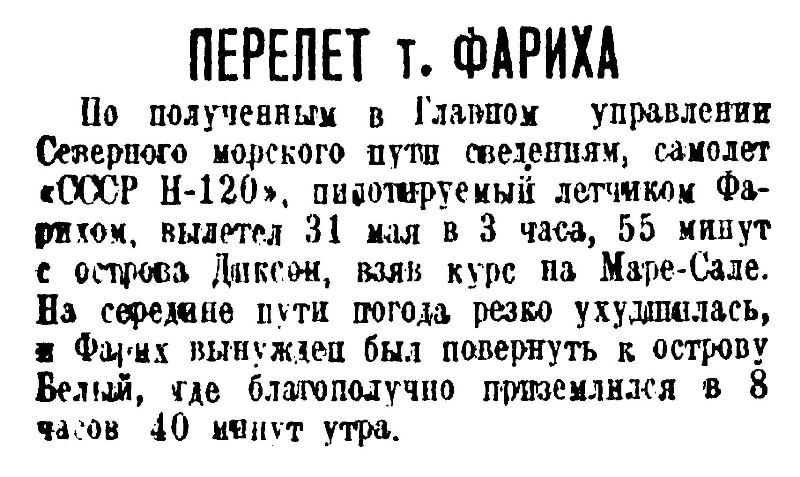 Вместе с тов. Фарих прибыл участвующий в перелёте Москва — Уэллен — Москва помощник начальника политуправления ГУСМП тов. Басс. В качестве бортмехаников летят тт. Чагин и Демидов. На борту самолета находится специальный корреспондент «Правды» т. Шаров В.