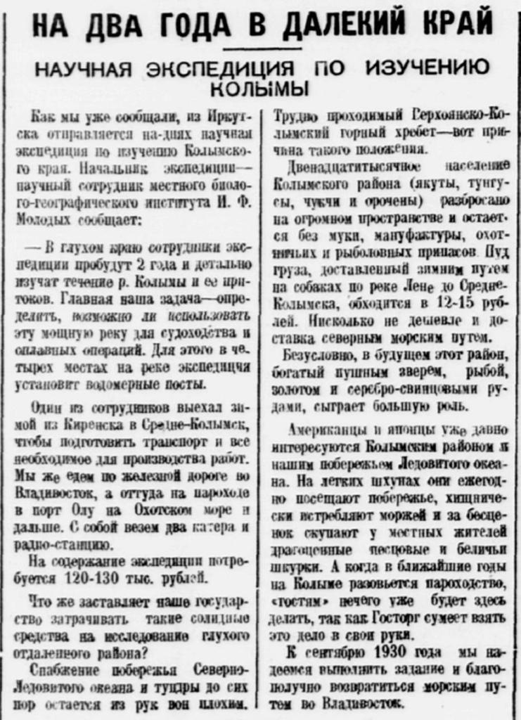 В ближайшие дни в Колымский край отправится научная экспедиция, организованная наркомпутем и возглавляемая инженером И. Ф. Молодых. В глухом краю сотрудники экспедиции (их 24) пробудут два года и детально изучат течение Колымы и ее притоков.