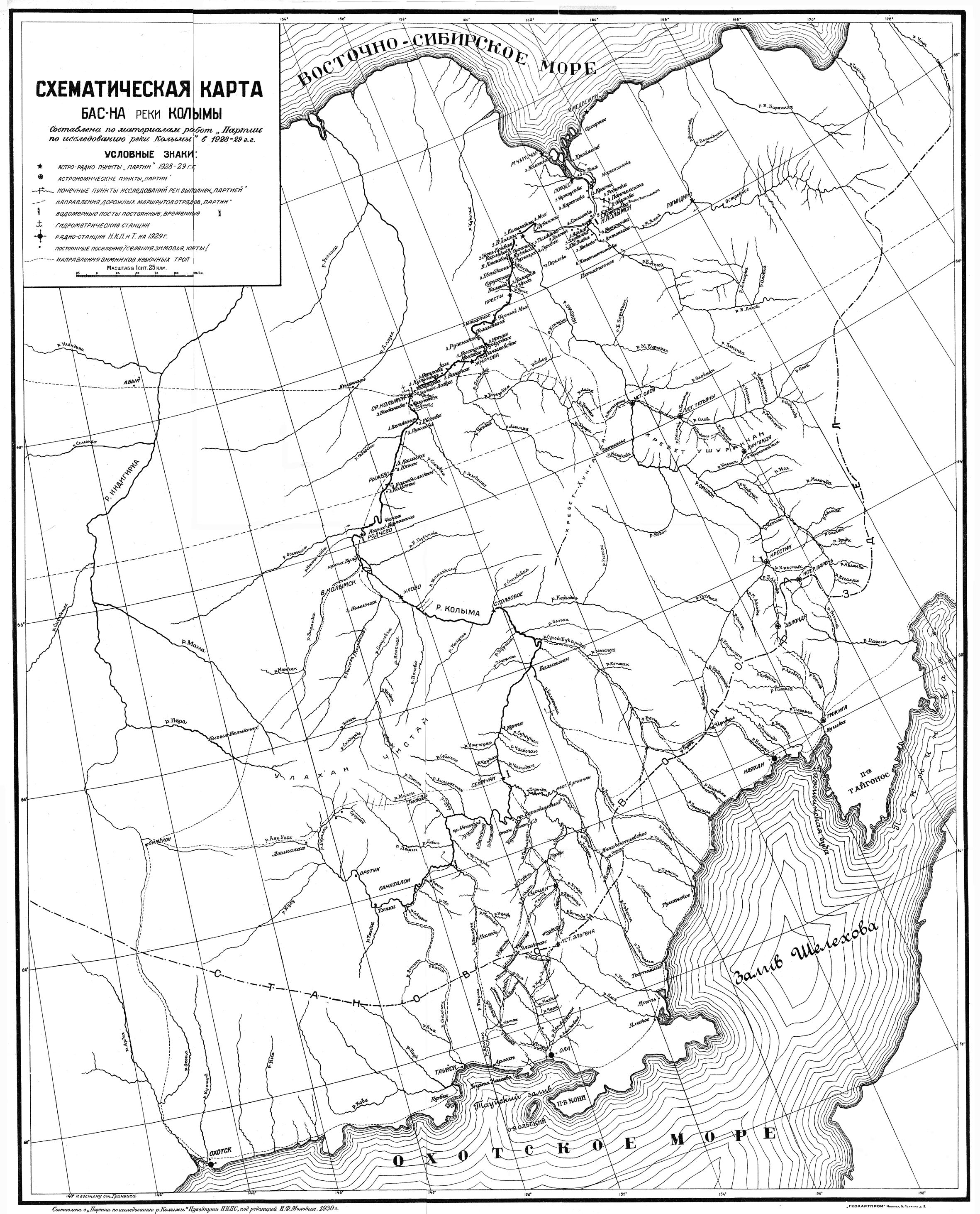 В результате работ нашей экспедиции оказалось, что верхнее течение реки Колымы изображается на современных географических картах совершенно неправильно как в отношении количества, дли» рек и их названий, так и их географического положения. Колыма находится значительно восточнее, описывая от истоков и до Коркодона дугу, приближаясь в районе течения Детрин-Бохапча к Тауйскому заливу на расстояние до 300 км и в районе Буюнда — Сугой — к заливу Шелехова (к Гижигинской губе) на 300 — 350 км. Например пункт Сеймчан имеет положение почти на В 1/2 0 на восток и на 1 1/2 на юг против дававшегося ему изображения на современных картах.