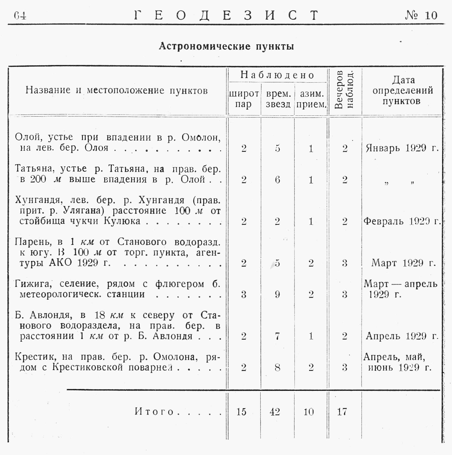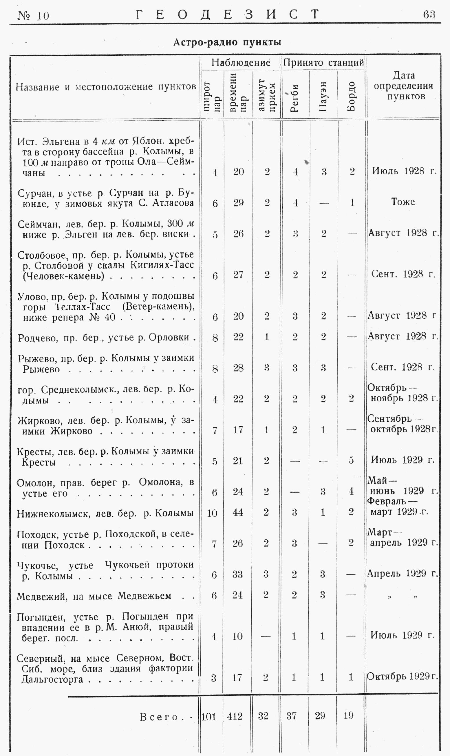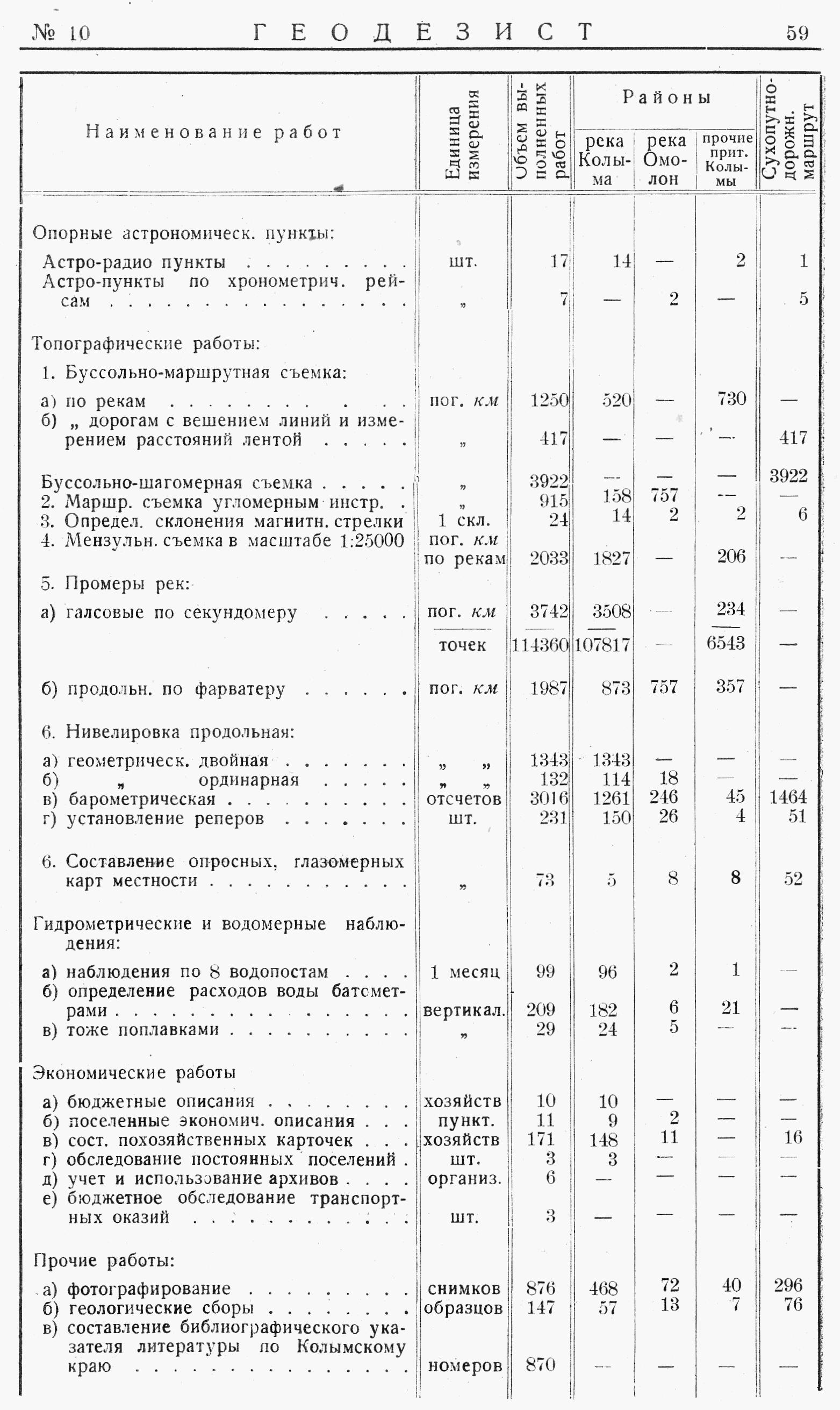 По р. Омолону и маршруту от г. Среднеколымска на пос. Гижигу по линии астрономических работ выполнено два хронометрических рейса Среднеколымск-Наяхан и Наяхан-Нижнеколымск; определено 7 пунктов. Наблюдение времени велось по способу Павлова, а наблюдение широт — методами измерения азимутов звезд вблизи первого вертикала.
