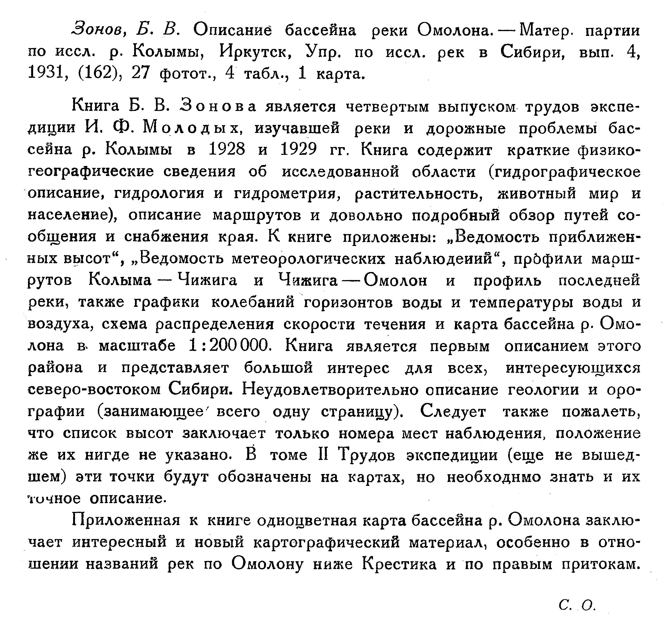 Зонов, Б. В. Описание бассейна реки Омолона. — Матер. партии по иссл. р. Колымы, Иркутск, Упр. по иссл. рек в Сибири, вып. 4, 1931, (162), 27 фотог., 4 табл., 1 карта.