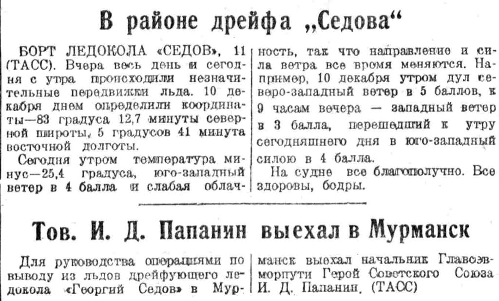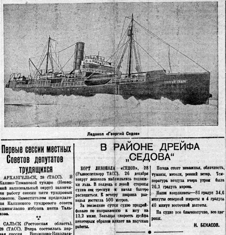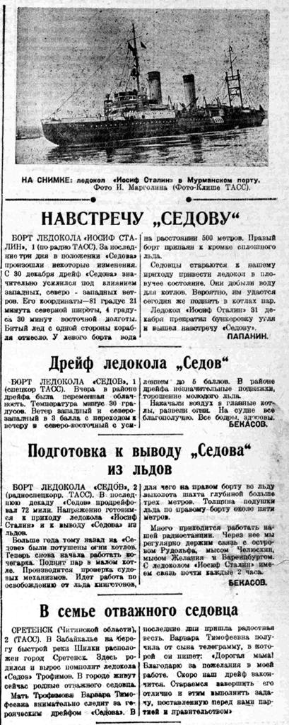 По решению правительства Союза ССР в ближайшие дни из Мурманска на Север выходит линейный ледокол «И. Сталин», задачей которого является помощь экипажу «Седова» в выводе корабля из тяжелых льдов.