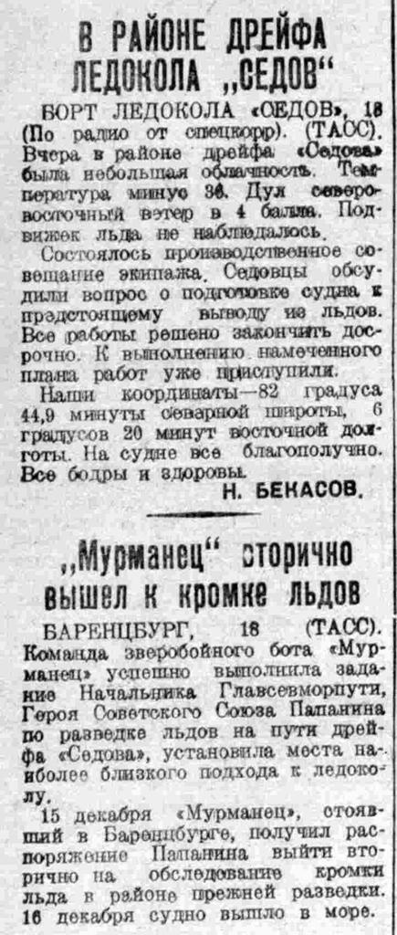 «Мурманец» обследует ледовую обстановку в районе «Седова», также поддерживает постоянную радиосвязь с радистами ледокола Полянским и Бекасовым. Такую же задачу он выполнил весной 1938 года. Тогда «Мурманец» под командованием орденоносца Ульянова принимал участие в экспедиции по снятию с дрейфующей льдины героев папанинцев. Как сообщает капитал Сулаков, плавание «Мурманца» проходит благополучно.