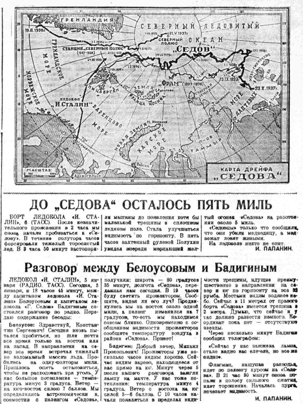 ЛЕДОКОЛ «И. СТАЛИН», 5 января (РАДИО. ТАСС). Сегодня, 5 января, в 18 часов 45 минут, между капитаном ледокола «И. Сталин» Белоусовым и капитаном ледокола «Г. Седов» Бадигиным состоялся разговор по радио. Передаю содержание беседы: