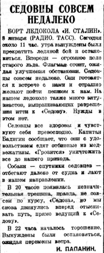БОРТ ЛЕДОКОЛА «И. СТАЛИН». 8 января (РАДИО. ТАСС). Сегодня около 11 час. утра вынуждены были прекратить ледяной бой и остановиться. Впереди — огромное поле старого льда. Флагман стоит, ожидая улучшения обстановки. Седовцы совсем недалеко. Они готовятся к встрече с нами и страшно желают пойти пешком к нам. На нашем ледоколе также много энтузиастов, выпрашивающих разрешения итти к «Седову». Нужды в этом нет.