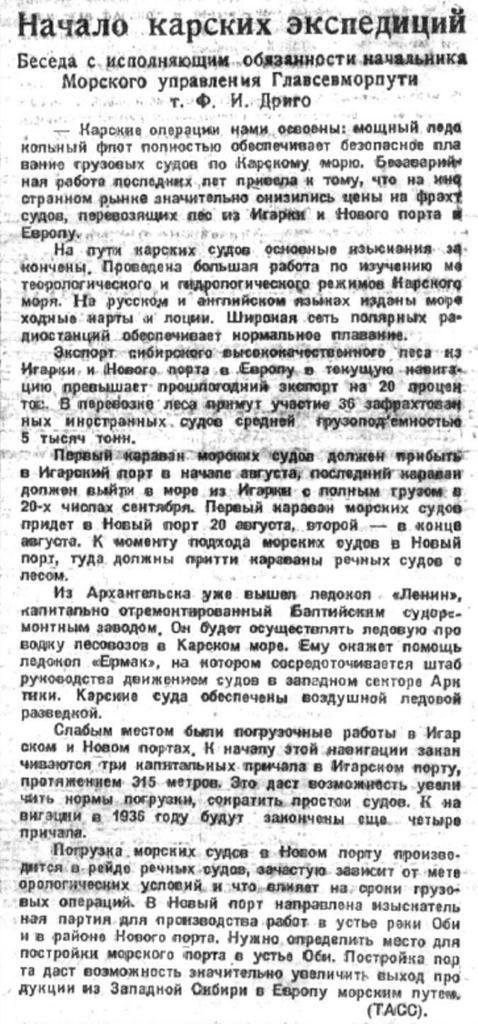 В результате проведения Карской операции 1935 г. на 30 иностранных пароходах и на одном советском вывезено из Игарки в иностранные порты 39 511 стандартов пиломатериалов, на 5 иностранных пароходах из Нового Порта вывезено 5366 стандартов и на 9 советских пароходах из Игарки — 4725 стандартов пиломатериалов (в Мурманск).