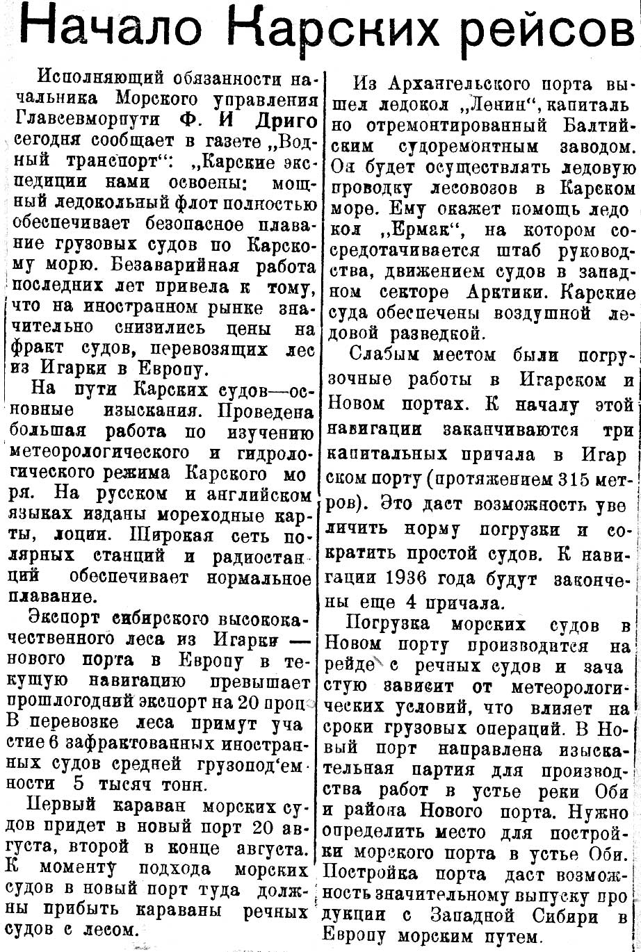 Первый караван судов под проводкой "Ленина" вышел в Карское море из Югорского Шара 25 июля. В состав этого каравана входили: л/п "Русанов", шедший на р. Индигирку, лесовозы: "Крестьянин", "Молотов" и "Сакко", шедшие на р. Лену, и шведский пароход "Фрам“, шедший с грузом на о. Диксона для снабжения углем судов, следующих на восток, а затем в Игарку за экспортным лесом.