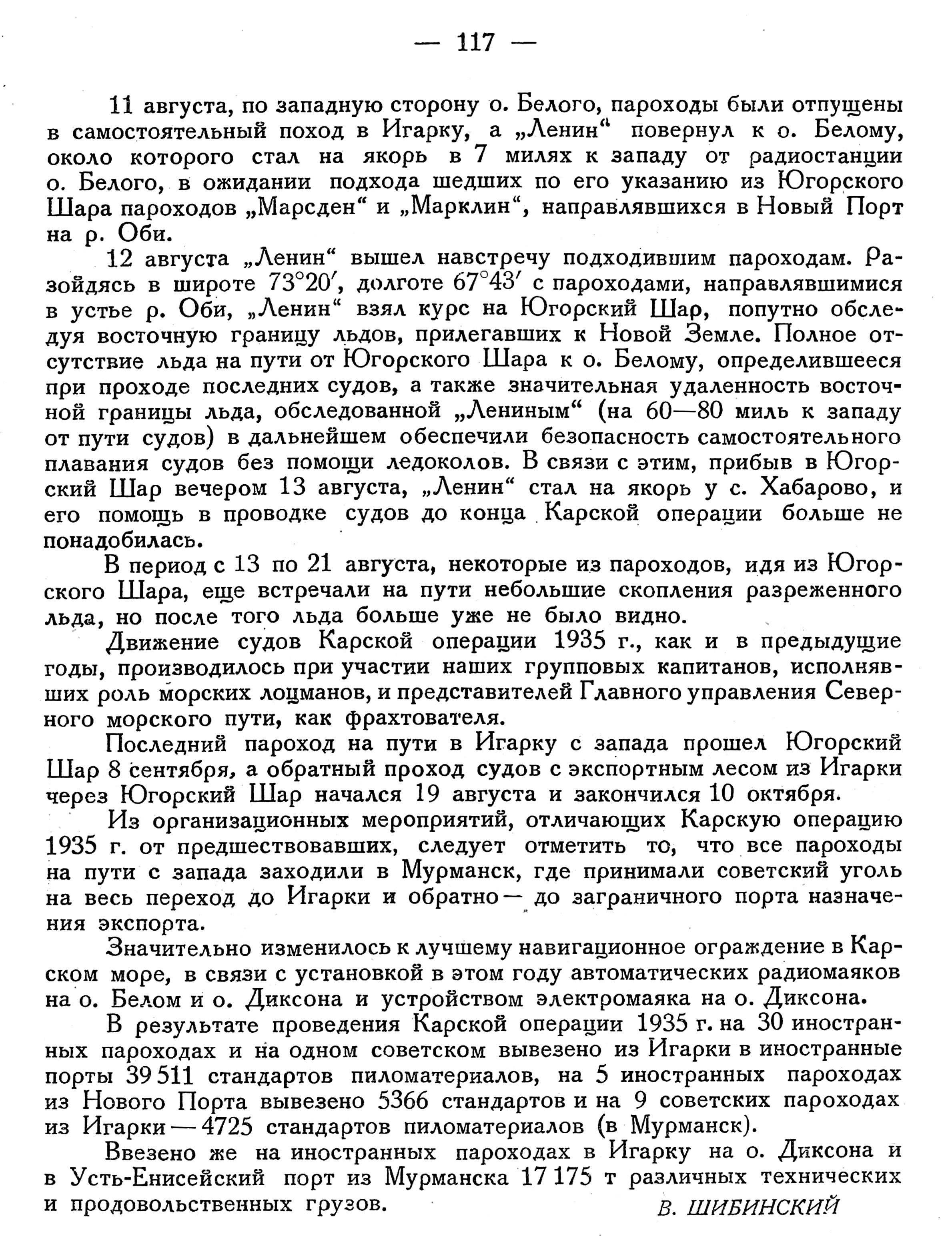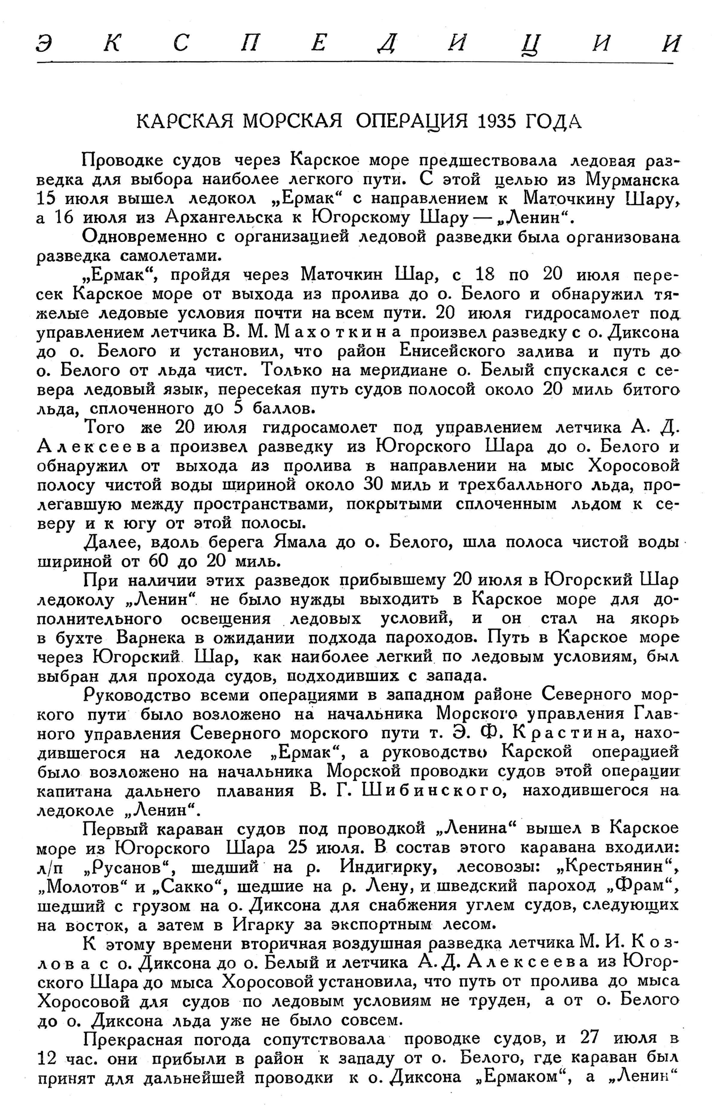 Движение судов Карской операции 1935 г., как и в предыдущие годы, производилось при участии наших групповых капитанов, исполнявших роль морских лоцманов, и представителей Главного управления Северного морского пути, как фрахтователя.
