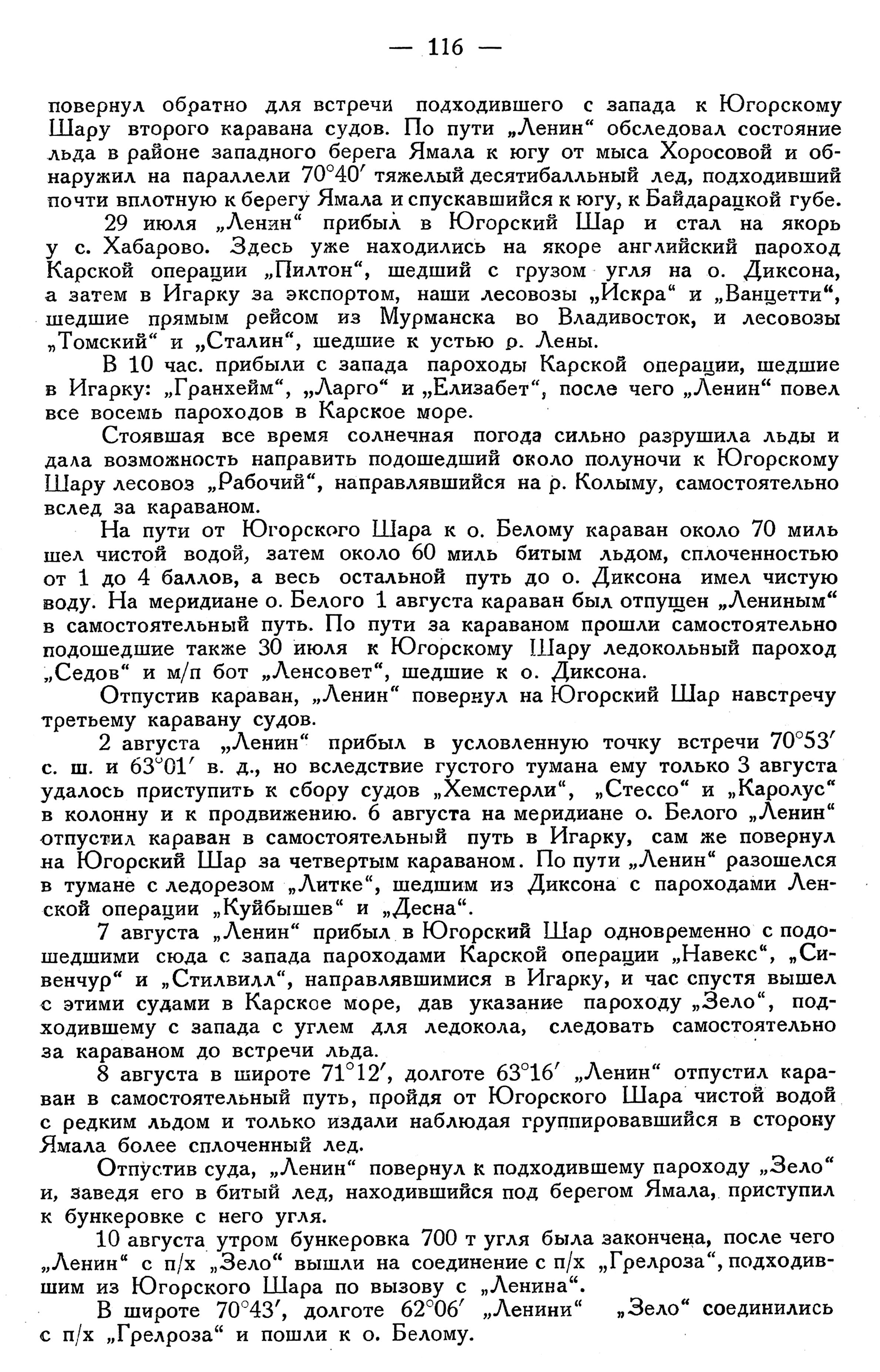В 10 час. прибыли с запада пароходы Карской операции, шедшие в Игарку: "Гранхейм", "Ларго" и "Елизабет", после чего "Ленин" повел все восемь пароходов в Карское море.