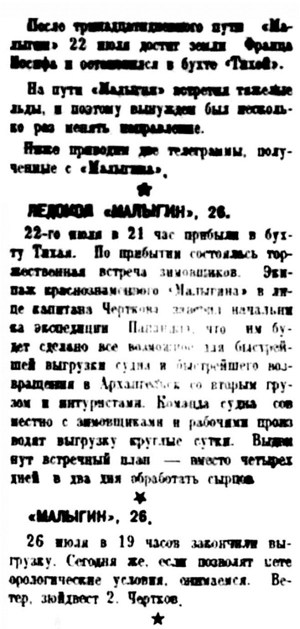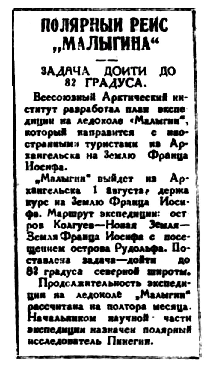 На борту „Малыгина“ находились также иностранные туристы и в числе их генеральный секретарь международного о-ва „Аэроарктик" Вальтер Брунс, имевший специальное задание исследования условий посадки дирижаблей в арктических областях на сушу и на лед.