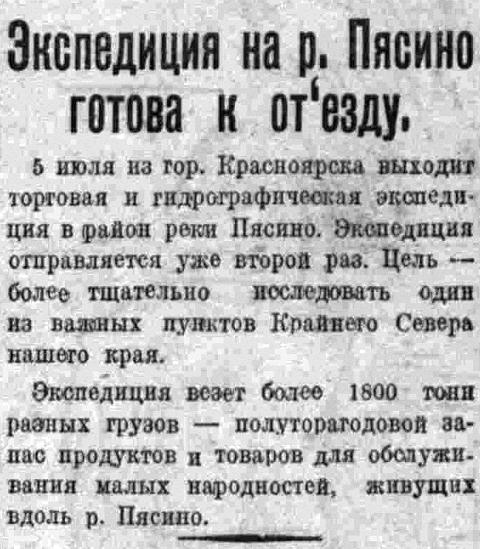 5 июля из гор. Красноярска выходит торговая и гидрографическая экспедиция в район реки Пясино. Экспедиция отправляется уже второй раз. Цель — более тщательно исследовать один из важных пунктов Крайнего Севера нашего края.
