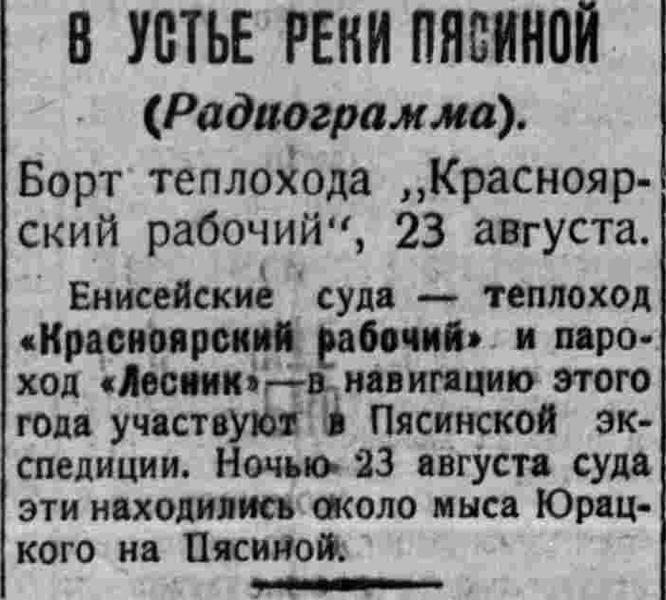 С борта теплохода «Красноярский рабочий» сообщают, что Пясинская экспедиция благополучно закончила свои работы. Караван двинулся в обратный путь. 5 сентября суда прибыли на мыс «Входной» и 6 сентября выйдут отсюда, держа курс на остров Диксон.