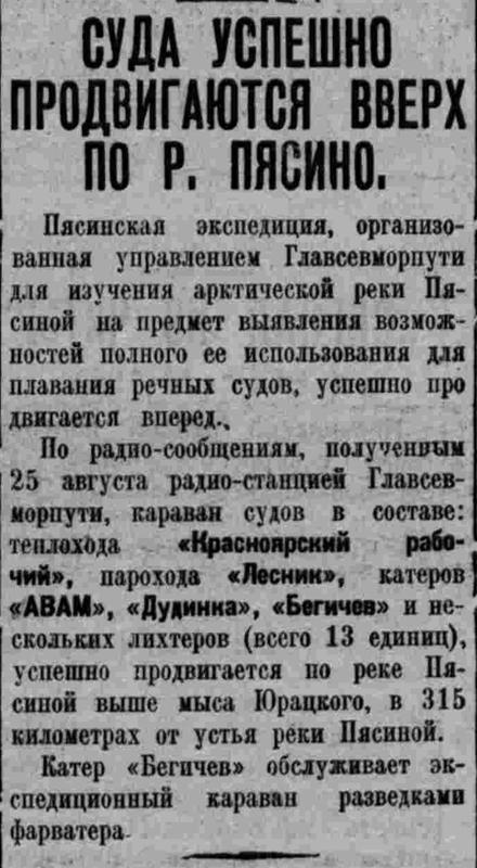 Пясинская экспедиция, организованная управлением Главсевморпути для изучения арктической реки Пясиной на предмет выявления возможностей полного ее использования для плавания речных судов, успешно про двигается вперед.