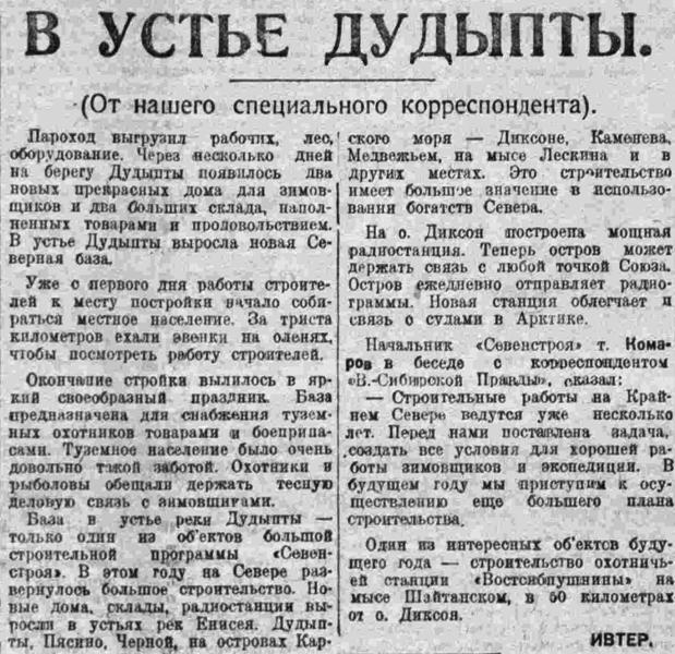 База в устье реки Дудыпты — только одни на объектов большой строительной программы «Севенстроя». В этом году на Севере развернулось большое строительство. Новые дома, склады, радиостанции выросли в устьях рек Енисея. Дудыпты, Пясино, Черной, на островах Карского моря — Диксоне, Каменева, Медвежьем, на мысе Лескина и в других местах. Это строительство имеет больше значение в использовании богатств Севера.