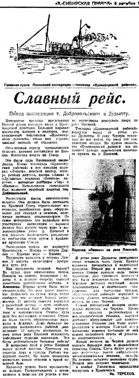 Караван Пясинской экспедиции во главе с теплоходом «Красноярский рабочий», под руководством нач. экспедиции Добровольского, 28 августа благополучно прибыл к конечному пункту своего похода — Дудинку.