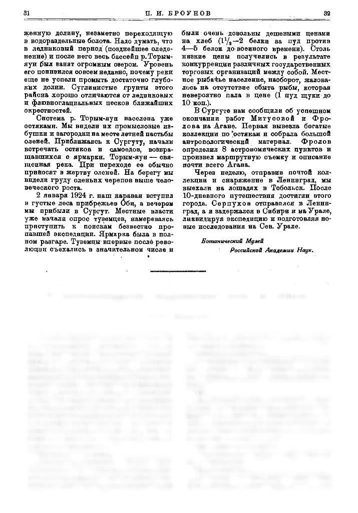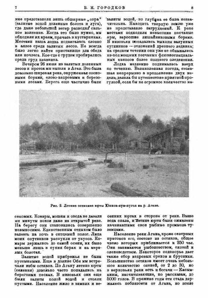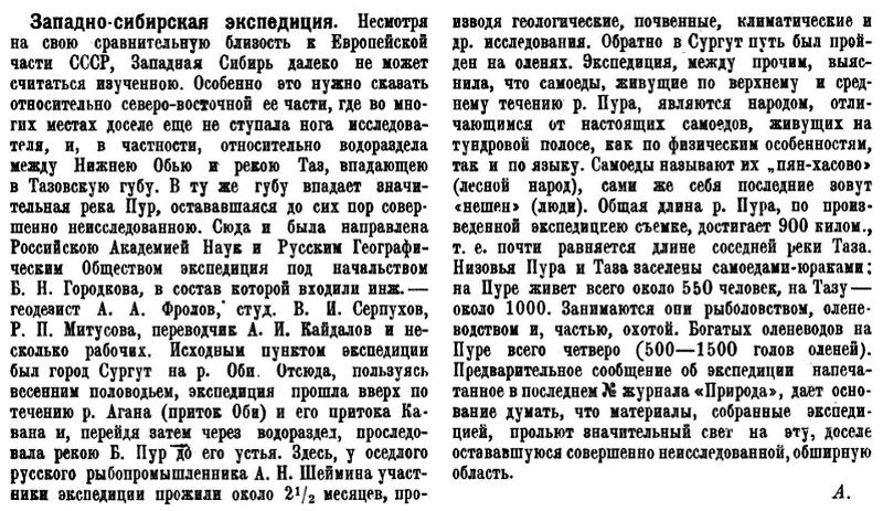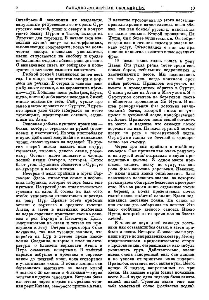 Из Ленинграда экспедиция выехала 23—26 мая 1923 г. Около трех недель было затрачено на окончательное снаряжение и переезд до Сургута. В состав экспедиции входили, кроме уже упомянутого А. А. Фролова и меня (почвенно-ботанические исследования), студент Горного Института В. И. Серпухов, приглашенный для производства маршрутной съемки, и Р. П. Митусова, прикомандированная Русским Музеем для антропологических и этнографических наблюдений среди остяков Агана.