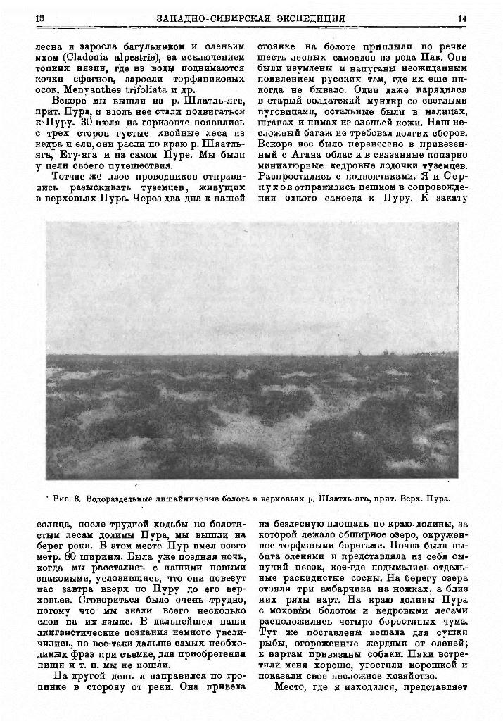Еще близ озера Пяку-то все чаще и чаще среди сосновых лесов стали попадаться кедровники. К югу от рр. Янг-яга (верховья р. Пяку-Пётл) появилась пихта и осина. Елово-кедровые острова и рямы с мелкой сосной непрерывно чередовались с участками болот, усеянных крупными буграми, между которыми ныряли наши нарты; По этим бугристым болотам мы шли два дня. Ландшафт напоминал горную страну в миниатюре: повсюду громоздятся хребты и цепи вершин, поднимаются отдельные куполообразные сопки, но высота их не превышает 4 метр. Верхушки бугров часто почти лишены снега и издали чернеют своим выветрившимся сухим торфом. Склоны бугров с вечной мерзлотой густо зарастают торфяниковыми кустарниками, над которыми возвышаются отдельные угнетенные березы и кедры. Между буграми мокрые, топкие сфагновые болота. Крупно-бугристые торфяники (бугристая тундра) особенно характерны для южной границы вечной мерзлоты в местах о обильным подтоком грунтовых вод.