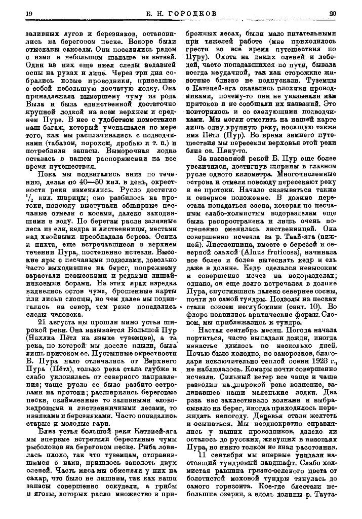 4 августа с двумя молодыми самоедами мы начали подниматься на двух обласах вверх по Пуру, захватив с собой лишь небольшой багаж. Мы надеялись добраться до верховьев реки. Долинная растительность Пура сильно отличалась от Кавана. Между тем как там преобладали сосновые боры и лиственничные леса, а кедровники были редкостью, здесь, наоборот, кедр и ель господствовали. Огромные лиственницы высоко поднимались над лесами, а густые ивняки и березняки покрывали береговые пески. Прибрежные леса были наполнены кедровками, резкие крики которых будили нас с восходом солнца. Очень часто попадались гари, заваленные колодником. Местами река подмывала край долины, и тогда к воде подступали обрывистые яры до 8 метр. высотой. Они всегда были сложены желтыми песками с галькой и мелкими валунами, лишь близ уровня воды выходили прослойки более глинистых песков. Яры зарастали лишайниковыми борами на подзолах, ничем не отличавшимися от водораздельных. Максимальную мощность песчаные подзолы имели на верхнем Агане и Каване; по мере движения к северу глубина оподзоленного горизонта уменьшалась. В небольшом расстоянии от берега сосновые леса обыкновенно сменялись торфяниками, а песчаные подзолы болотно-подзолистыми и торфянисто-болотными почвами, которые, в свою очередь, скоро уступали место мерзлому торфу в 2—3 метр. глубиной.