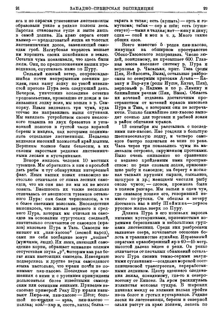 Вскоре явилось человек 10 местных туземцев. Мы обратились к ним с просьбой дать рыбы и тут обнаружили интересный факт. Язык наших новых знакомцев настолько отличался от языка лесных самоедов, что ни они нас ни мы их не могли понять. Внешность их также несколько отличалась от внешности туземцев остального Пура: они были черноволосы, а те с более светлыми волосами. Впоследствии выяснилось, что жители верхнего и среднего Пура, которых мы считали за самоедов на основании сургутских сведений, значительно отличаются от самоедов (юраков) низовьев Пура и Таза. Самоеды называют их „пян-хасово“ (лесной народ), сами же себя последние зовут „нешен“ (мужчины, люди). Их язык, имеющий самоедские корни, обращает внимание полным отсутствием звука „р“, которым как раз богат язык настоящих самоедов. Изменению подверглись и другие звуки самоедского языка настолько, что юраки почти не понимают пян-хасово. Последние при сношениях с ними и с русскими принуждены пользоваться более известными самоедским или остяцким языками. Приведем несколько примеров. Реку Пур юраки называют Пюра-ям, пян-хасово — Пётл; большой по-юрацки — арка, пян-хасово — нахлка; нож — хар и, соотв., катль; белка — таряга и татля; есть (кушать) — орть и гомуткома; табак — сяр и шён; есть (существует) — тыня и таддия; нет — гонку и дику; один -— опой и моп и т. д. Много также общих слов.