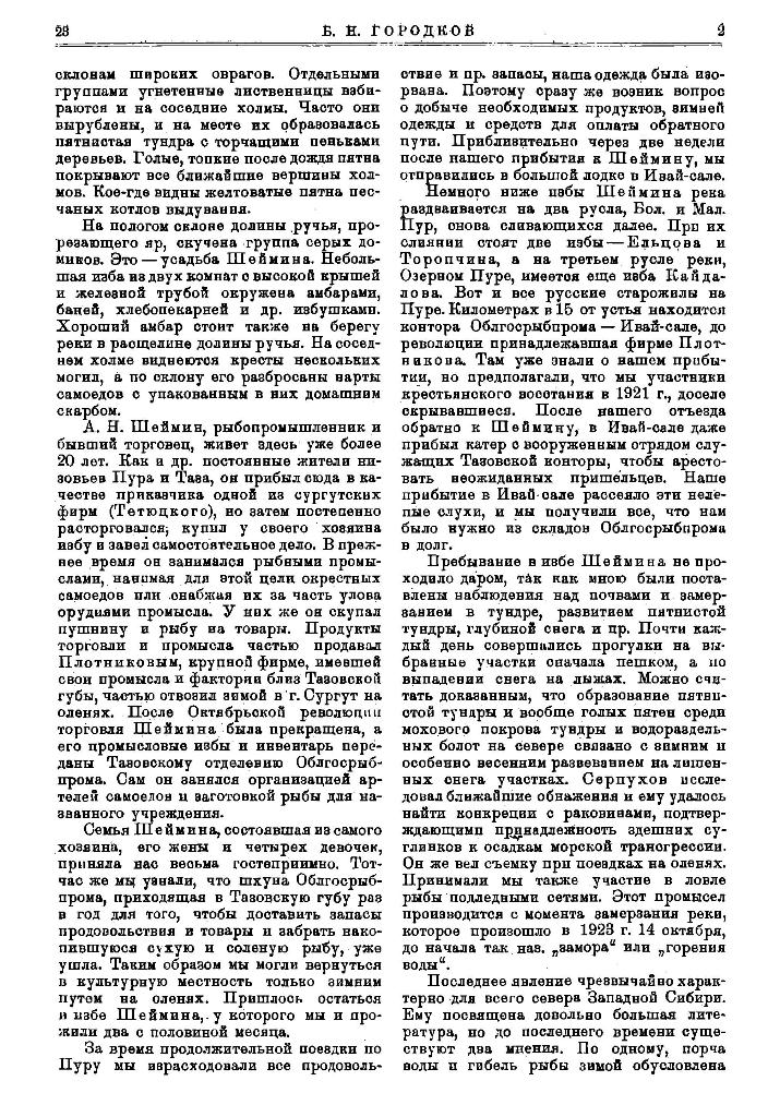 Пребывание в избе Шеймина не проходило даром, так как мною были поставлены наблюдения над почвами и замерзанием в тундре, развитием пятнистой тундры, глубиной снега и пр. Почти каждый день совершились прогулки на выбранные участки сначала пешком, а по выпадении снега на лыжах. Можно считать доказанным, что образование пятнистой тундры и вообще голых пятен среди мохового покрова тундры и водораздельных болот на севере связано с эимним и особенно весенним развеванием на лишенных снега участках. Серпухов исследовал ближайшие обнажения и ему удалось найти конкреции с раковинами, подтверждающими принадлежность здешних суглинков к осадкам морской трансгрессии. Он же вел съемку при поездках на оленях. Принимали мы также участие в ловле рыбы подледными сетями. Этот промысел производится с момента замерзания реки, которое произошло в 1923 г. 14 октября, до начала так наз. „замора“ или „горения воды“.