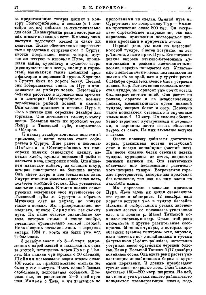 Первый день мы шли по безлесной моховой тундре, а затем вступили на лед р. Тап-яга, левого прит. Пура. Его широкая долина заросла ольхово-березовыми кустарниками и редкими лиственничными лесами, изредка попадается ель. Угнетенные лиственничные лески поднимаются из долины на ее край, как и у других речек. 6 декабря среди этих лесков была устроена дневка. За р. Тап-яга снова началась холмистая тундра, но горизонт уже почти всегда был закрыт лиственницей. Она растет по речкам, оврагам и на незаболоченных песках, возвышающихся среди моховой тундры, мокрых болот и озер. Довольно часто попадаются отдельные и скученные холмы выс. 4—10 метр. Их склоны обыкновенно зарастают кустарниками и деревьями, а вершины почти всегда обнажены ветром от снега. На них замечены валуны и галька.