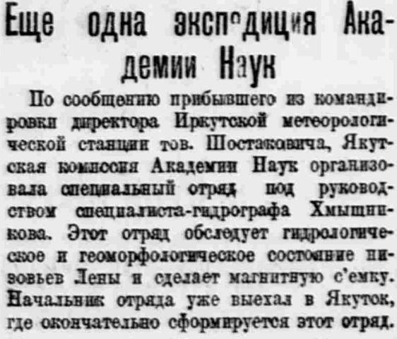 По сообщению прибывшего из командировки директора Иркутской метеорологической станции тов. Шостаковича, Якутская комиссия Академии Наук организовала специальный отряд под руководством специалиста-гидрографа Хмызникова. Этот отряд обследует гидрологическое и геоморфологическое состояние низовьев Лены и сделает магнитную съемку. Начальник отряда уже выехал в Якутск, где окончательно сформируется этот отряд.