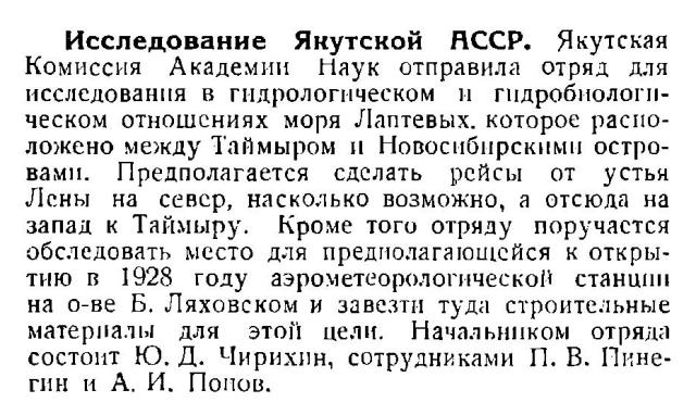 Исследование Якутской ЯССР. Якутская Комиссия Академии Наук отправила отряд для исследования в гидрологическом и гидробиологическом отношениях моря Лаптевых, которое расположено между Таймыром и Новосибирскими островами. Предполагается сделать рейсы от устьи Лены на север, насколько возможно, а отсюда на запад к Таймыру. Кроме того отряду поручается обследовать место для предполагающейся к открытию п 1928 году агрометеорологической станции на о-ве Б. Ляховской и завезти туда строительные материалы для этой цели. Начальником отряда состоит Ю. Д. Чирихин, сотрудниками Н. В. Пинегин и А. И. Попов.