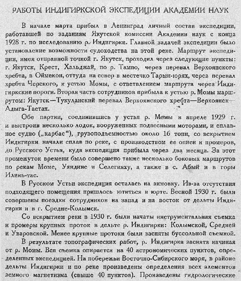 В начале марта прибыл в Ленинград личный состав экспедиции, работавшей по заданиям Якутской комиссии Академии наук с конца 1928 г. по исследованию р. Индигирки. Главной задачей экспедиции было установление возможности судоходства на этой реке. Маршрут экспедиции, имея отправной точкой г. Якутск, проходил через следующие пункты: г. Якутск, Крест, Хальджай, по р. Тампо, через перевал Верхоянского хребта, в Оймекон, оттуда на север в местечко Тарын-юрях, через перевал хребта Черского, к устью Момы, с ответвлением маршрута через Индигиркские пороги. Вторая часть сотрудников прибыла к устью р. Момы маршрутом: Якутск — Тукуланский перевал Верхоянского хребта — Верхоянск — Адыга-Тастах.