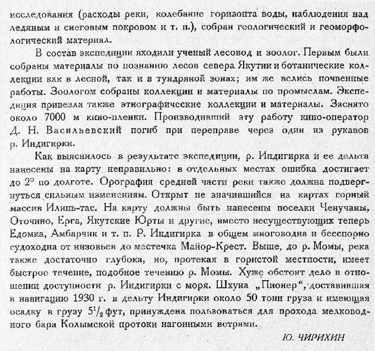 Как выяснилось в результате экспедиции, р. Индигирка и ее дельта нанесены на карту неправильно: в отдельных местах ошибка достигает до 2° по долготе. Орография средней части реки также должна подвергнуться сильным изменениям. Открыт не значившийся на картах горный массив Илинь-тас. На карту должны быть нанесены поселки Ченучаны, Оточино, Ерга, Якутские Юрты и другие, вместо несуществующих теперь Едомка, Амбарчик и т. п. Р. Индигирка в общем многоводна и бесспорно судоходна от низовьев до местечка Майор-Крест. Выше, до р. Момы, река также достаточно глубока, но, протекая в гористой местности, имеет быстрое течение, подобное течению р. Момы. Хуже обстоит дело в отношении доступности р. Индигирки с моря. Шхуна „Пионер", доставившая в навигацию 1930 г. в дельту Индигирки около 50 тонн груза и имеющая осадку в грузу 5 1/2 фут, принуждена пользоваться для прохода мелководного бара Колымской протоки нагонными ветрами.