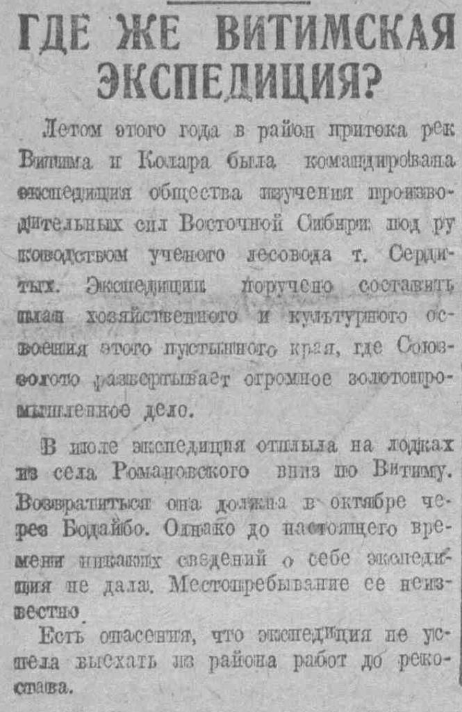 В июле экспедиция отплыла на лодках из села Романовского вниз по Витиму. Возвратиться она должна в октябре через Бодайбо. Однако до настоящего времени никаких сведений о себе экспедиция не дала. Местопребывание ее неизвестно.