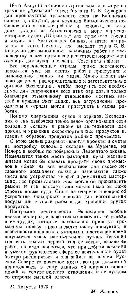 18-го Августа вышел из Архангельска в море на траулере "Дельфин" отряд биолога Е. К. Суворова для производства траллового лова на Канинских банках и, попутно, для научных биологических исследований в том же районе и, наконец, на этих днях уходит из Архангельска в море парусно-моторное судно "Шарлотта" для промысла трески и акулы на Колгуевских банках, а затем направится в устье Печоры, где высадит отряд С. В. Керцелли для выполнения различных работ по оленеводству и для организации заготовки мороженной оленины для нужд населения Северного Района.
