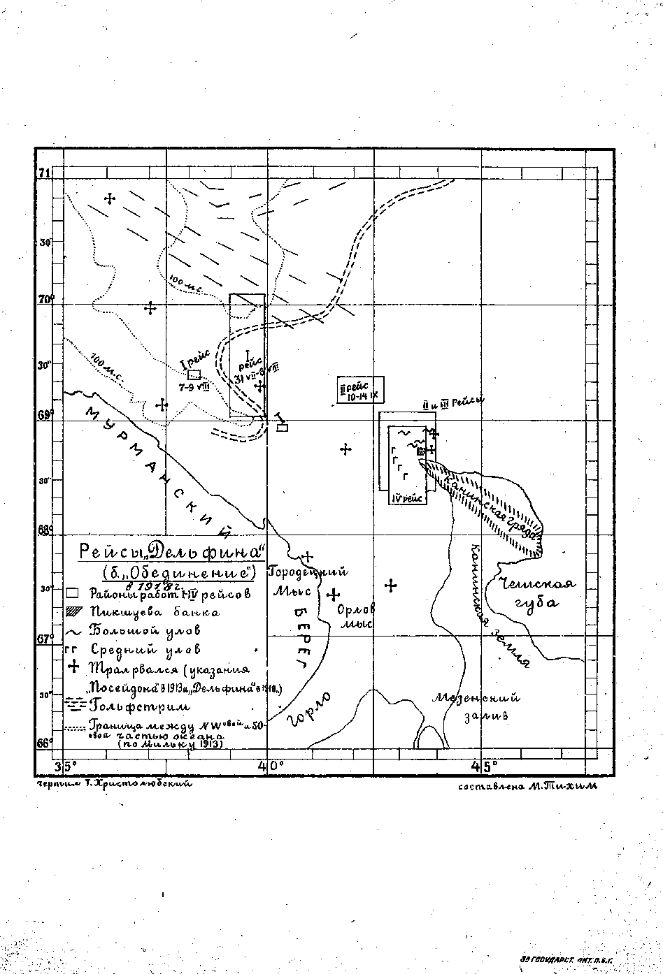 Северная научно-промысловая экспедиция в первый год существования развернула работы по всему Советскому Европейскому Северу: от побережья Кольского полуострова до пролива Югорский Шар. Экспедиционно-исследовательские работы в море проводились на трех небольших гидрографических судах - тральщике «Дельфин», шхунах «Шарлотта» и «Надежда».
