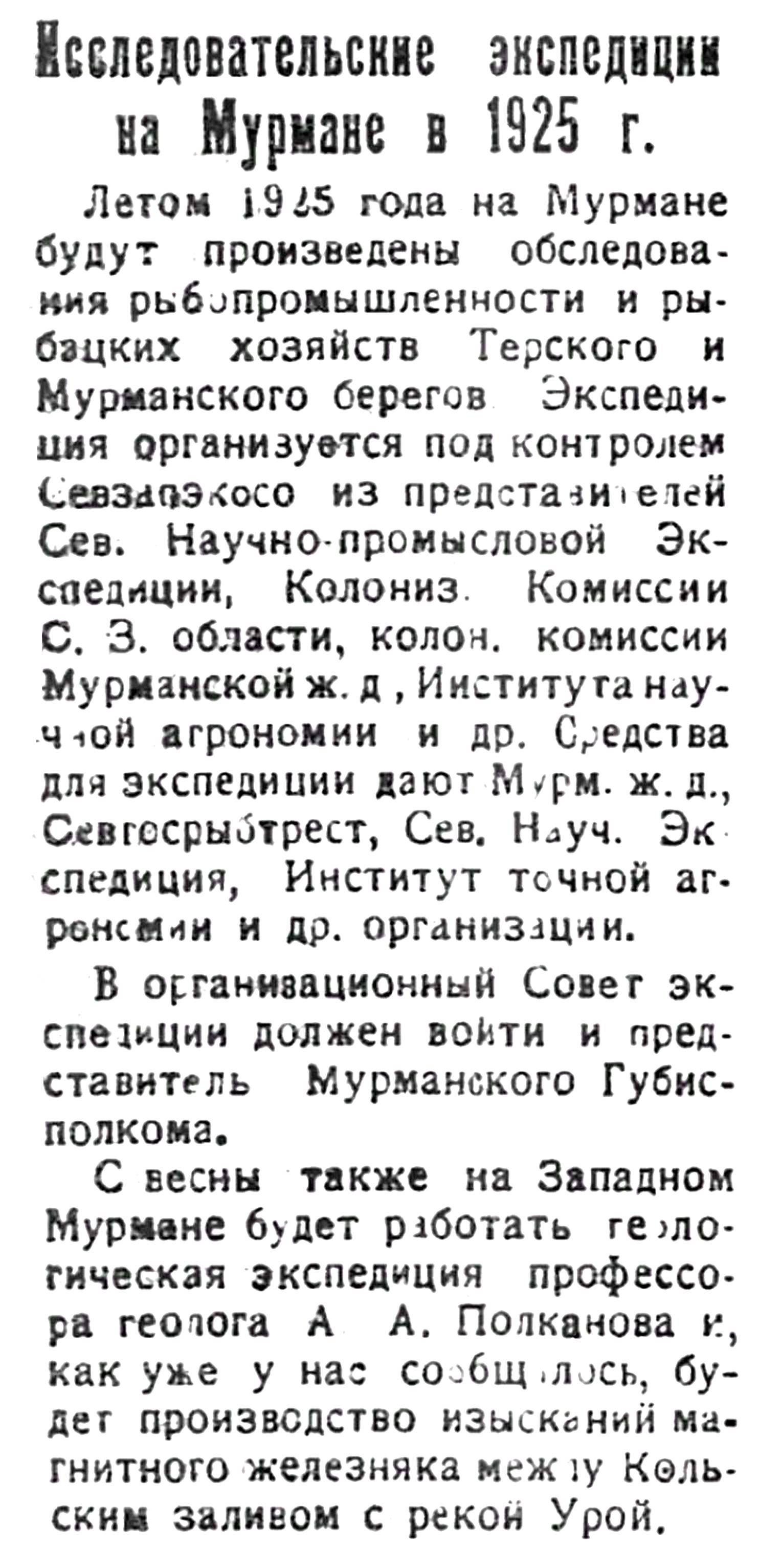 Летом 1925 года на Мурмане будут произведены обследования рыбопромышленности и рыбацких хозяйств Терского и Мурманского берегов. Экспедиция организуется под контролем Севзапэкосо из представителей Сев. Научно промысловой Экспедиции, Колониз. Комиссии С. 3. области, колон. комиссии Мурманской ж. д, Института научной агрономии и др. Средства для экспедиции дают Мурм. ж. д., Севгосрыбтрест, Сев. Науч. Экспедиция, Институт научной агрономии и др. организации.