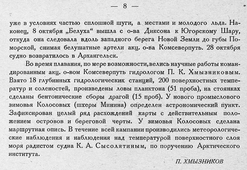 {2} Описание и научные результаты экспедиции см. у П. К. Хмызникова. К гидрологии восточной части Карского моря; Отчет о походе шхуны «Белуха» в 1931 г. (Архив ААНИИ, св. 7); И. Сендик. Описание плавания м/с «Белуха» в 1931 г. «Записки по гидрографии», 1932. № 6.