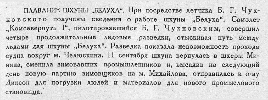 ПЛАВАНИЕ ШХУНЫ „БЕЛУХА". При посредстве летчика Б. Г. Чухновского получены сведения о работе шхуны „Белуха“. Самолет „Комсеверпуть 1“, пилотировавшийся Б. Г. Чухновским, совершил четыре продолжительные ледовые разведки, отыскивая путь между льдами для шхуны „Белуха". Разведка показала невозможность прохода судна вокруг м. Челюскина. 11 сентября шхуна вернулась в шхеры Минина, сменила зимовавших промышленников и, высадив на следующий день новую партию зимовщиков на м. Михайлова, отправилась к о-ву Диксон для погрузки людей и материалов для нового промыслового становища.